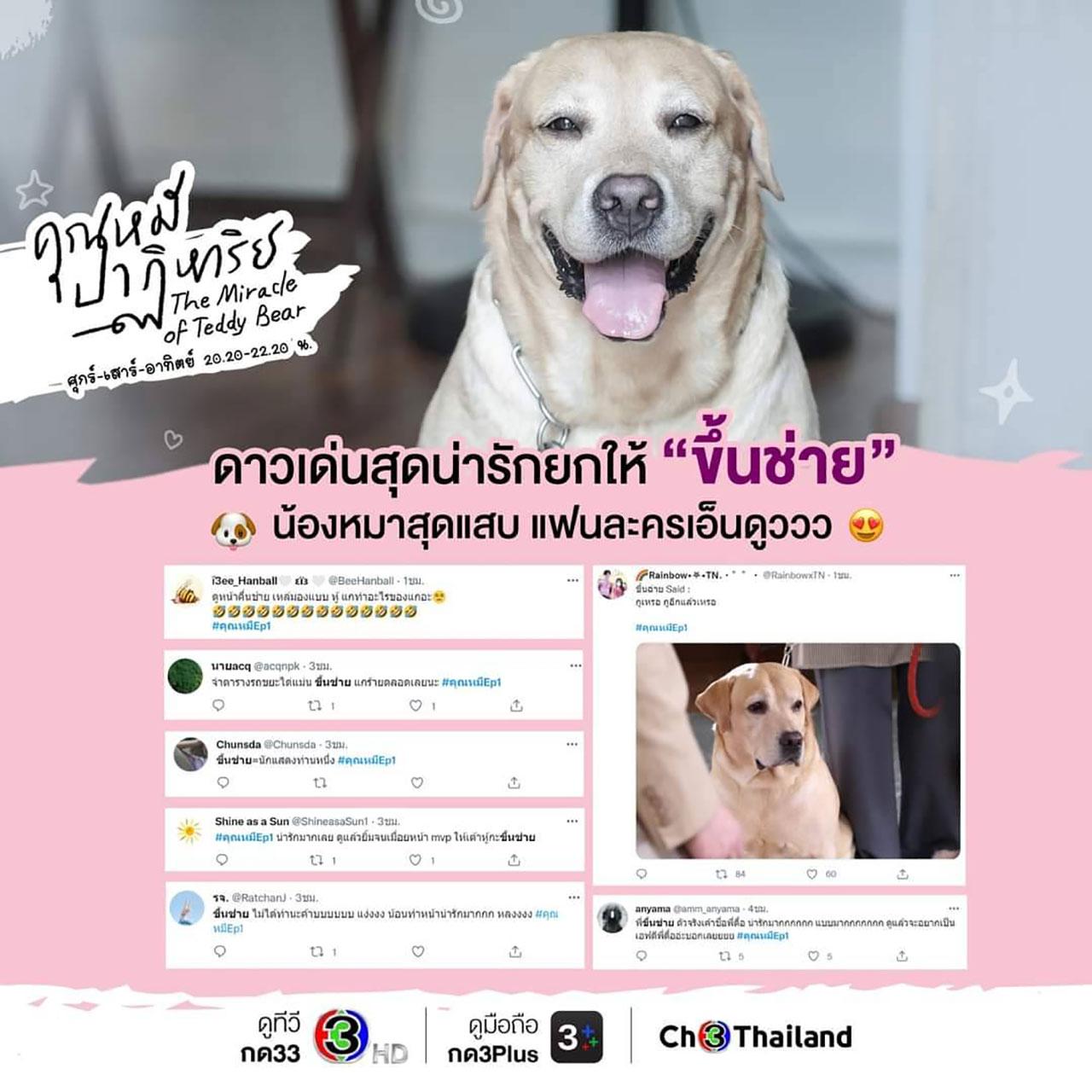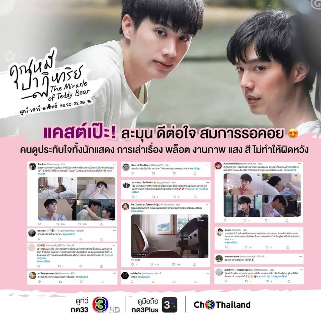 “คุณหมีปาฏิหาริย์” (The Miracle of Teddy Bear) ช่อง 3 ละครครอบครัวพล็อตดีสะท้อนมุมมอง LGBTQ+ ผลงานของ ค่ายถนัดละคร ที่เปิดตัวมาตอนแรกก็ทำคนดูลั่นคำชมเต็มโซเชียล ไม่ว่าจะชมเรื่อง พล็อตละครดีสมกับการที่แฟนๆ รอคอย ภาพแสงมุมกล้องสวยละมุนตา แถมตื่นตาตื่นใจไปกับความแฟนตาซีน่ารักของสิ่งของในเรื่องที่มีชีวิต พร้อมกับแจ้งเกิดดาวเด่นสุดน่ารักน้องหมา “ขึ้นช่าย” และคนดูยังชื่นชมหนักกับการที่ช่อง 3 กล้าฉีกกรอบนำเสนอละครวายในช่วงไพรม์ไทม์