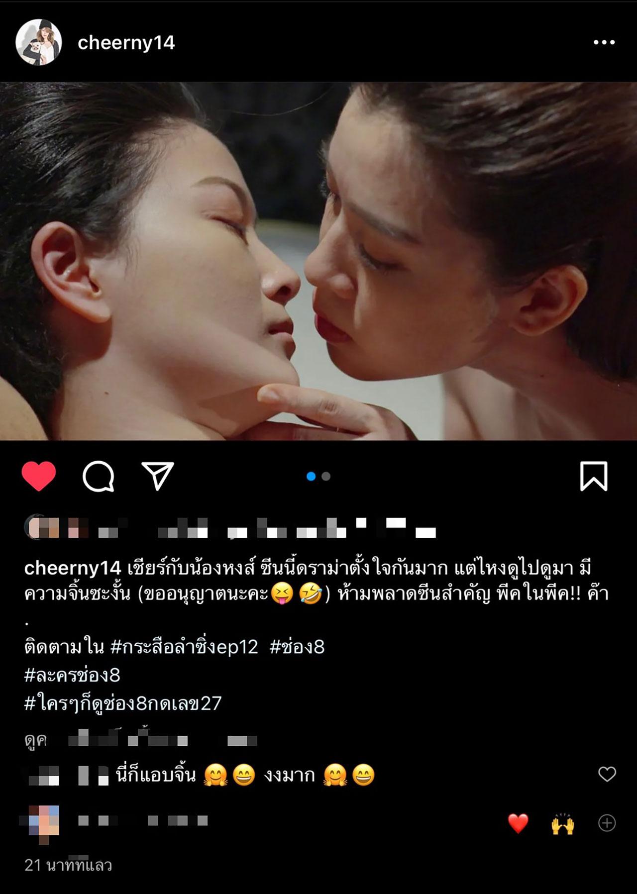 แถมแฟนๆ ก็ตามกันไปถล่มคอมเมนต์ทางหน้าอินสตาแกรมของสาวเชียร์กันยกใหญ่ เพราะเจ้าตัวโพสต์ภาพซีนดังกล่าว ด้วยแคปชั่นว่า เชียร์กับน้องหงส์ ซีนนี้ดราม่าตั้งใจกันมาก แต่ไหงดูไปดูมา มีความจิ้นซะงั้น (ขออนุญาตนะคะ) ห้ามพลาดซีนสำคัญ พีคในพีค!! ค๊า เพราะขนาดเจ้าตัวเองยังรู้สึกจิ้น เรียกว่าทำเอาไอจีสาวเชียร์ลุกเป็นไฟ ส่งผลให้ยอดการรับชมทางไลฟ์สดในเพจเฟซบุ๊กช่อง 8 ทะลุไปถึง 11.1K เพราะปฏิเสธไม่ได้เลยว่า กระสือลำซิ่ง ในอีพี 12 เข้มข้นครบรส ชวนลุ้นทุกวินาทีจริงๆ