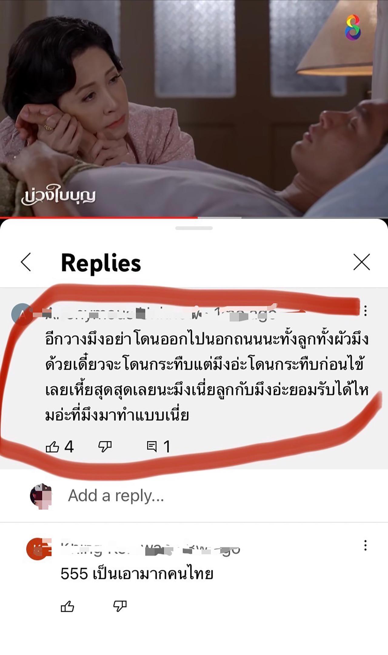 งานนี้แฟนละครคงอินจัด ขอคอมเมนต์เดือดระบายความในใจผ่านคลิปไฮไลต์ ละครบ่วงใบบุญในยูทูบช่อง 8 สาปแบบแซ่บๆ ว่า “อีกวางมึงอย่าเดินออกไปนอกถนนนะทั้งลูกทั้งผัวมึงด้วย เดี๋ยวจะโดนกระทืบแต่มึงอะโดนกระทืบก่อนใครเ...ยสุดเลยนะมึงเนี่ย ลูกมึงอะยอมรับได้ไหม ที่มึงมาทำแบบนี้” คุณพระช่วย!! โกรธแค้น กันอะไรเบอร์นี้ ก็ไม่รู้ว่าบทของสาวกวาง จะแรงเกินต้านไปไหม แต่ที่แน่ๆ สาวกวางแสดงออกมาได้ตีบทแตกกระจุย จนคนด่ากันทั่วบ้านทั่วเมืองกันเลยทีเดียว