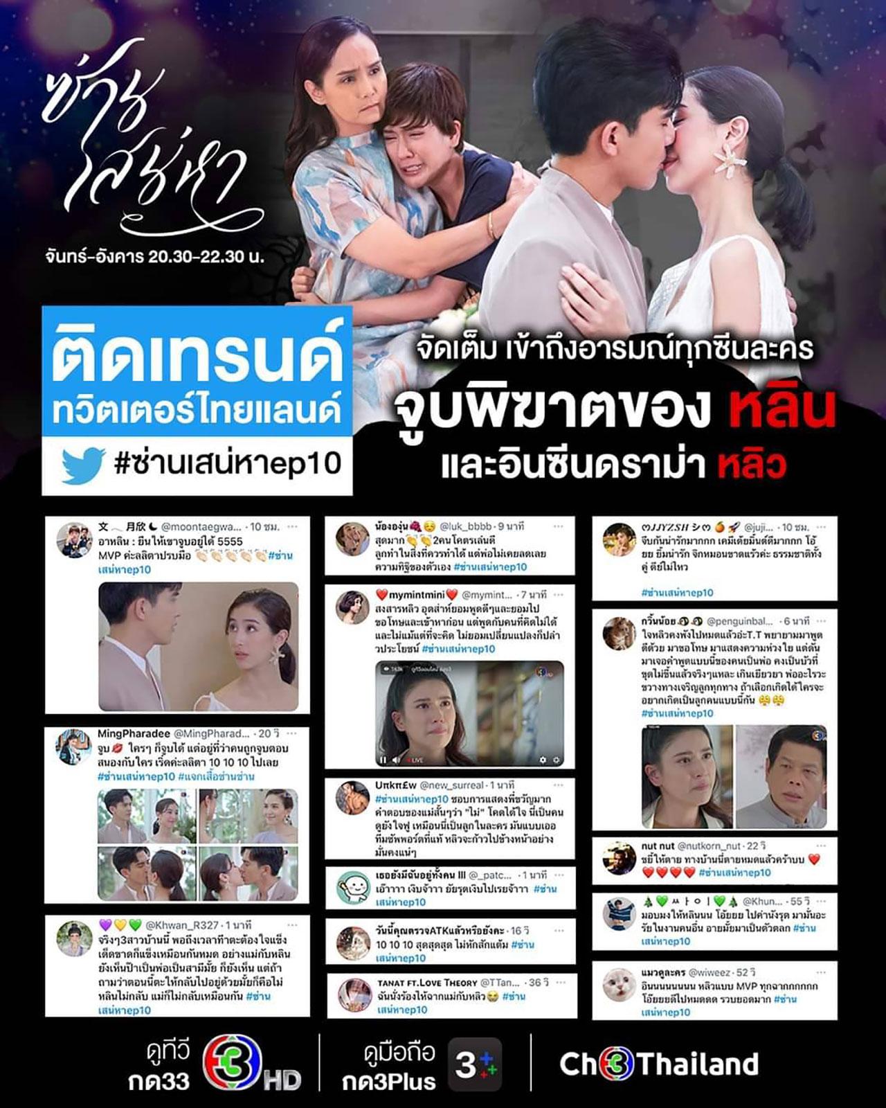 กระแสยังแรงไม่แผ่วสำหรับละคร “ซ่านเสน่หา” ทางช่อง 3 ละครชีวิตลูกผู้หญิงสู้ใจขาด ที่ยิ่งดูยิ่งมันฟาดแรงแบบฉุดไม่อยู่ และใน ep.10 นี่เองที่ทำเรตติ้งในกลุ่มผู้ชมอายุ 15 ปีขึ้นไป ในกลุ่ม (Bangkok and Urban) หรือ 15+ BU พุ่งไปถึง 4.09 กับฉากจูบสนั่นจอ หลัง รุตระวี แสดงโดย “พลอย ชิดจันทร์ ห่ง” ตามป่วนอดีตคนรัก หมื่นไมล์ แสดงโดย “เต้ย พงศกร เมตตาริกานนท์” โดน หลิน แสดงโดย “มิ้นต์ ชาลิดา วิจิตรวงศ์ทอง” จัดหนักโชว์จูบฟาด รุตระวี หน้าชา จนแฮชแท็ก #ซ่านเสน่หาep10 แรงติดเทรนด์ทวิตเตอร์ และยังทำยอดดูสดออนไลน์ไว้มากถึง 3.87 แสนคน