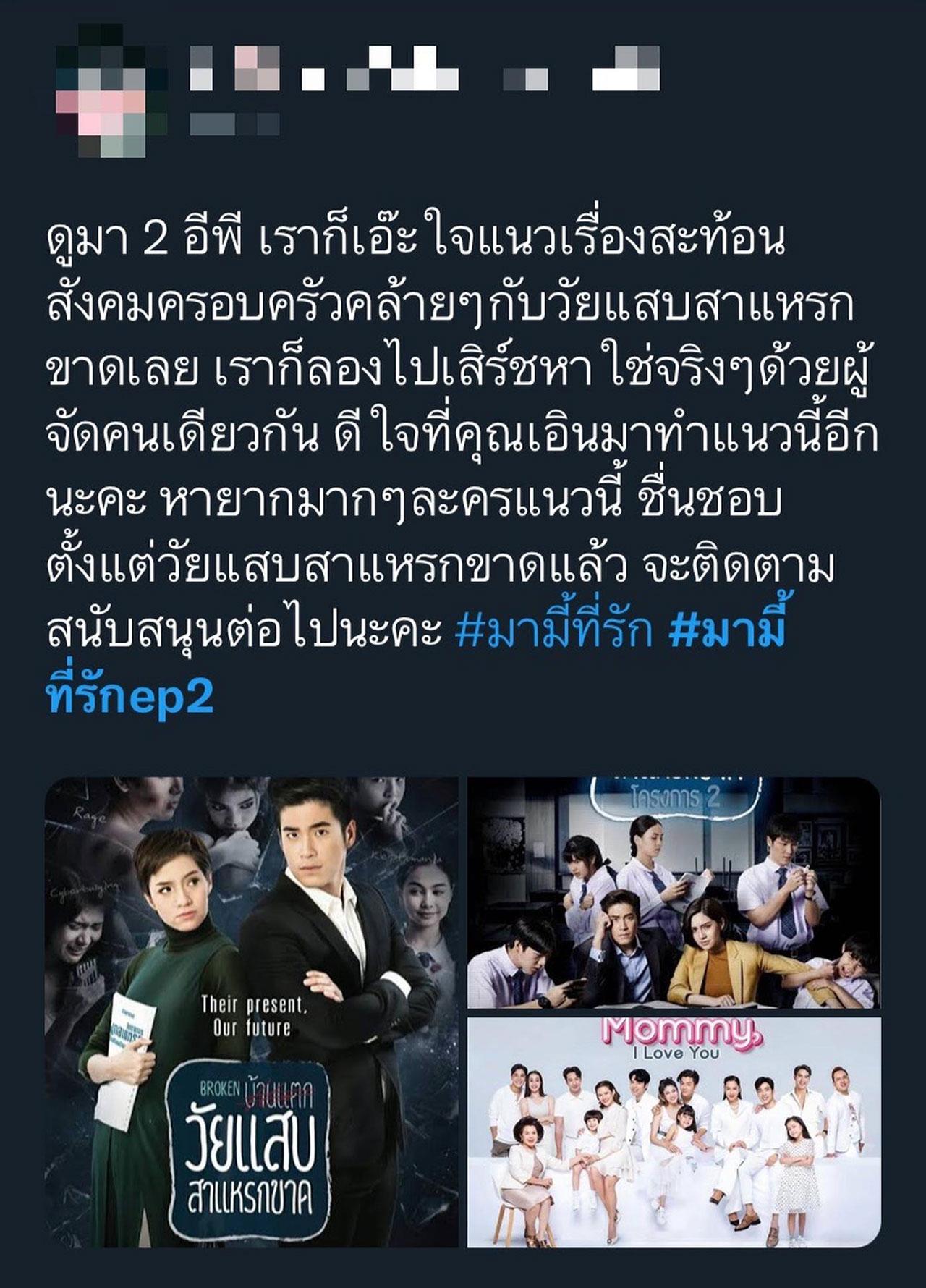 กระแสของละคร “มามี้ที่รัก” ออกตัวมาดีขนาดนี้ ใครที่ชอบดูละครแนวครอบครัวสะท้อนสังคมให้ข้อคิดดีๆ บวกกับแนวสืบสวนสอบสวน ไม่ควรพลาดกับละคร “มามี้ที่รัก” ทุกวันศุกร์ เสาร์ อาทิตย์ เวลา 20.20 น. ดูทีวีกด 33 ดูมือถือกด 3Plus