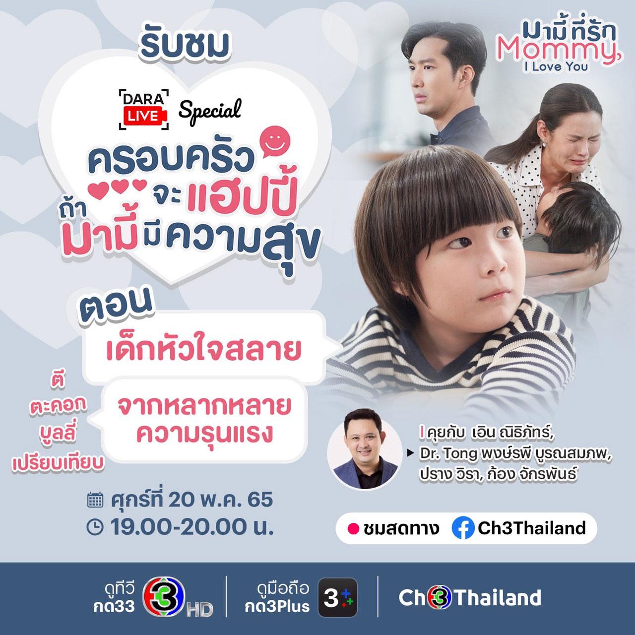 “Dara Live Special ครอบครัวจะแฮปปี้ถ้ามามี้มีความสุข” แค่เริ่มสตาร์ตไลฟ์ครั้งแรก ประเด็นการพูดคุยยังน่าสนใจและดึงดูดแฟน ๆ ได้ขนาดนี้ ดังนั้นห้ามพลาดไลฟ์สดครั้งที่ 2 พบกับ “Dr.Tong พงษ์รพี”, “ปราง วิรา” และ “ก้อง จักรพันธ์” ซึ่งจะมาพูดคุยในหัวข้อ “เด็กหัวใจสลายจากหลากหลายความรุนแรง” ในวันศุกร์ 20 พฤษภาคม 2565 เวลา 19.00 – 20.00 น. ทาง Facebook : Ch3Thailand และรับชมละคร “มามี้ที่รัก” ได้ทุกวันศุกร์ เสาร์ อาทิตย์ เวลา 20.20 น. ดูทีวีกด 33 ดูมือถือกด 3Plus