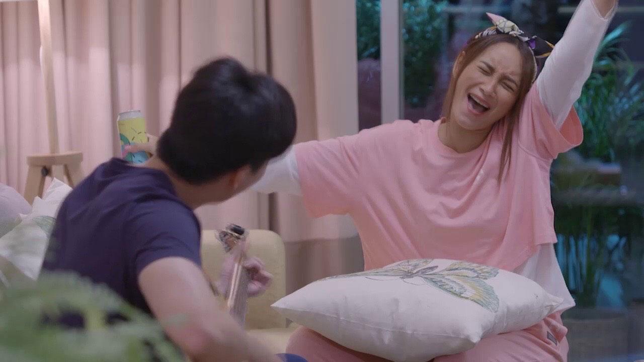 ฉากนี้ “ปุ๊ย-ผอูน จันทรศิริ” ผู้กำกับ ให้บี เน๋ง ใส่ฟีลรั่วๆ ฮาๆ ได้เต็มที่ โดยเฉพาะการร้องเพลง ขอชนิดแผดเสียง คร่อมคีย์กันไปเลย เพราะคนกรึ่มๆ มึนๆ ทำอะไรก็ไม่ผิด (ฮา) ทำเอา สาวบีขิงใส่เน๋งเบาๆ ว่าเป็นนักร้องมาก่อน เพี้ยนยังไงก็เพราะ เน๋งเลยเน้นโชว์ลีลาดีดกีตาร์ข่มกลับซะเลย เมื่อซักซ้อมกันจนเป๊ะ ถ่ายจริง บีแอบกลัวที่ต้องอยู่คนเดียว เน๋งเลยชวนดูทีวี เล่นทายเพลงแก้เบื่อ แต่จังหวะที่ฟรีสไตล์สุดๆ ก็ตอนร้องเพลงนี่แหละ บี เน๋ง ใส่กันสุดตัว ร้องตะโกนสุดเสียง เพี้ยนได้ใจ