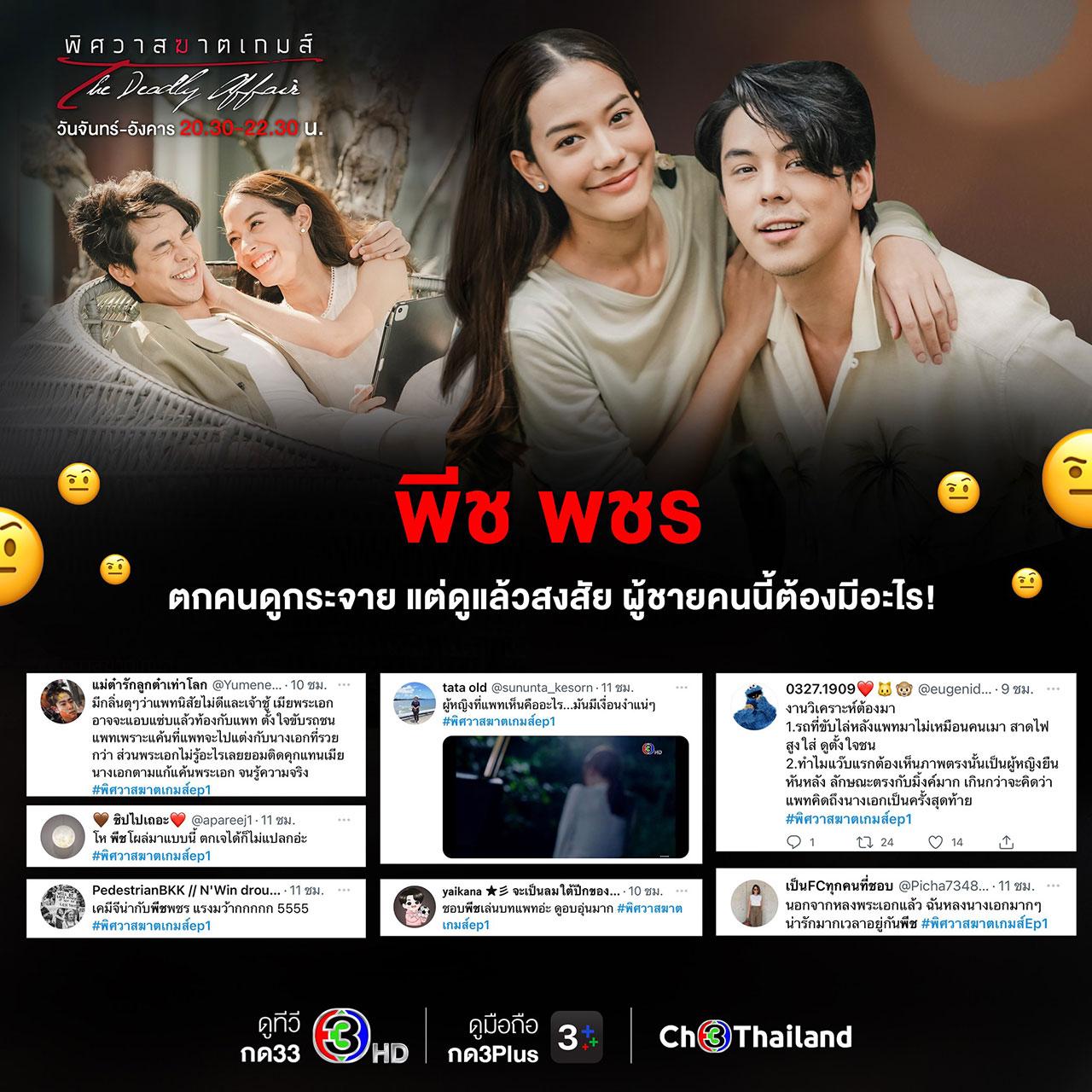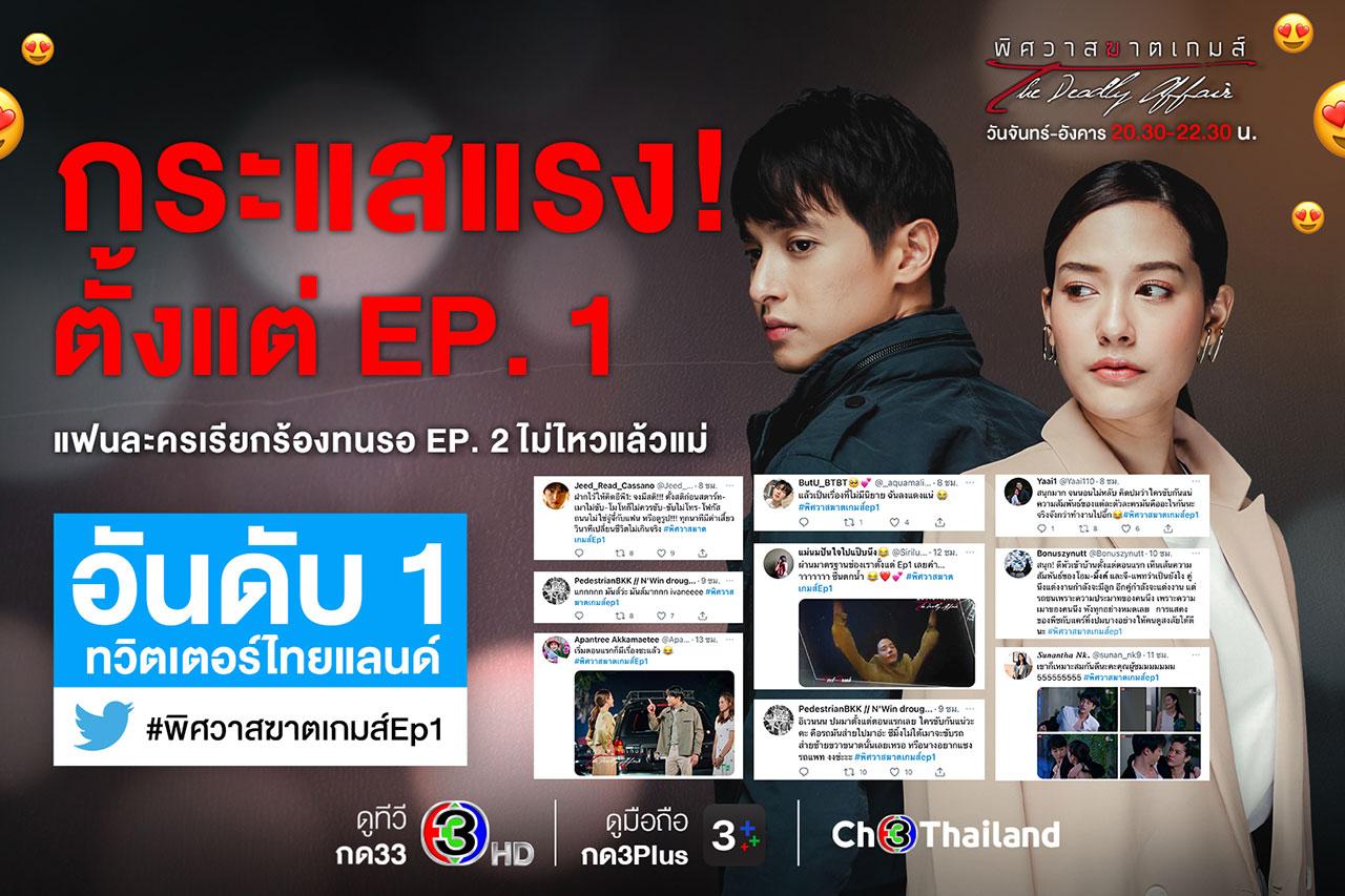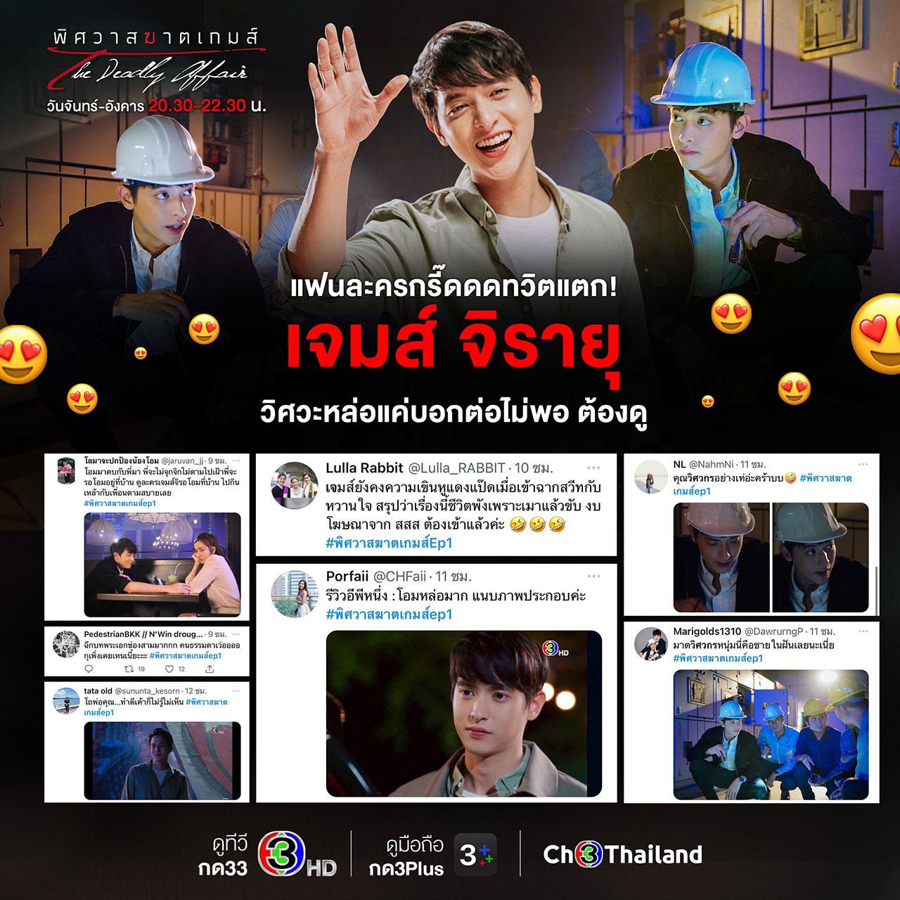 ไม่พูดถึงไม่ได้แล้วนาทีนี้กับกระแสความแรงแซงทางโค้งของ “พิศวาสฆาตเกมส์” ทางช่อง 3 การคัมแบ็กรอบใหญ่ของ “เจมส์ จิรายุ” ในบทหนุ่มวิศวกรไฟฟ้าที่ทำคนดูต้องอ้าปากค้าง ประกบสาว “จีน่า ญีนา” ที่โชว์สกิลการแสดงแบบที่ไม่เคยเห็นมาก่อน การันตีจากกระแสคำอวยเต็มโลกโซเชียลจนติดเทรนด์ทวิตเตอร์อันดับ 1 กับแฮชแท็ก #พิศวาสฆาตเกมส์ep1 และเปิดตัวด้วยเรตติ้งสุดปังในกลุ่มผู้ชมอายุ 15 ปีขึ้นไป ในกลุ่ม (Bangkok and Urban) หรือ 15+ BU ถึง 2.832