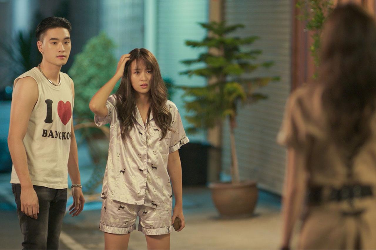 โดยฉากนี้ก่อนที่สาวเมโกะจะพาหนุ่มเซ้นต์ไปปลอบใจจากอาการช้ำรักแล้ว เมโกะยังต้องโชว์แมนปกป้องเซ้นต์สุดพลัง ซึ่งก่อนถ่ายจริงเมโกะกับนาราก็ได้ซ้อมคิวและบล็อกกิ้งกันอย่างละเอียดจนรู้จังหวะกันดีก็ให้สัญญาณผู้กำกับ แล้วเริ่มถ่ายทำจริงทันที เซ้นต์เดินคอตกโดนนาราทำเมินเหินห่างทิ้งของสำคัญที่กำลังจะเอามาง้อสาวที่รักลงถังขยะ แต่นารารู้ทันเลยตามมาเก็บของไว้พร้อมกับทวงถามความจริงบางอย่าง แต่เซ้นต์ไม่ตอบ งอนน้อยอกน้อยใจ โดนเมินเดินหนี จนทำให้นาราหงุดหงิดถอดรองเท้าปาใส่เซ้นต์ เพื่อให้หยุด