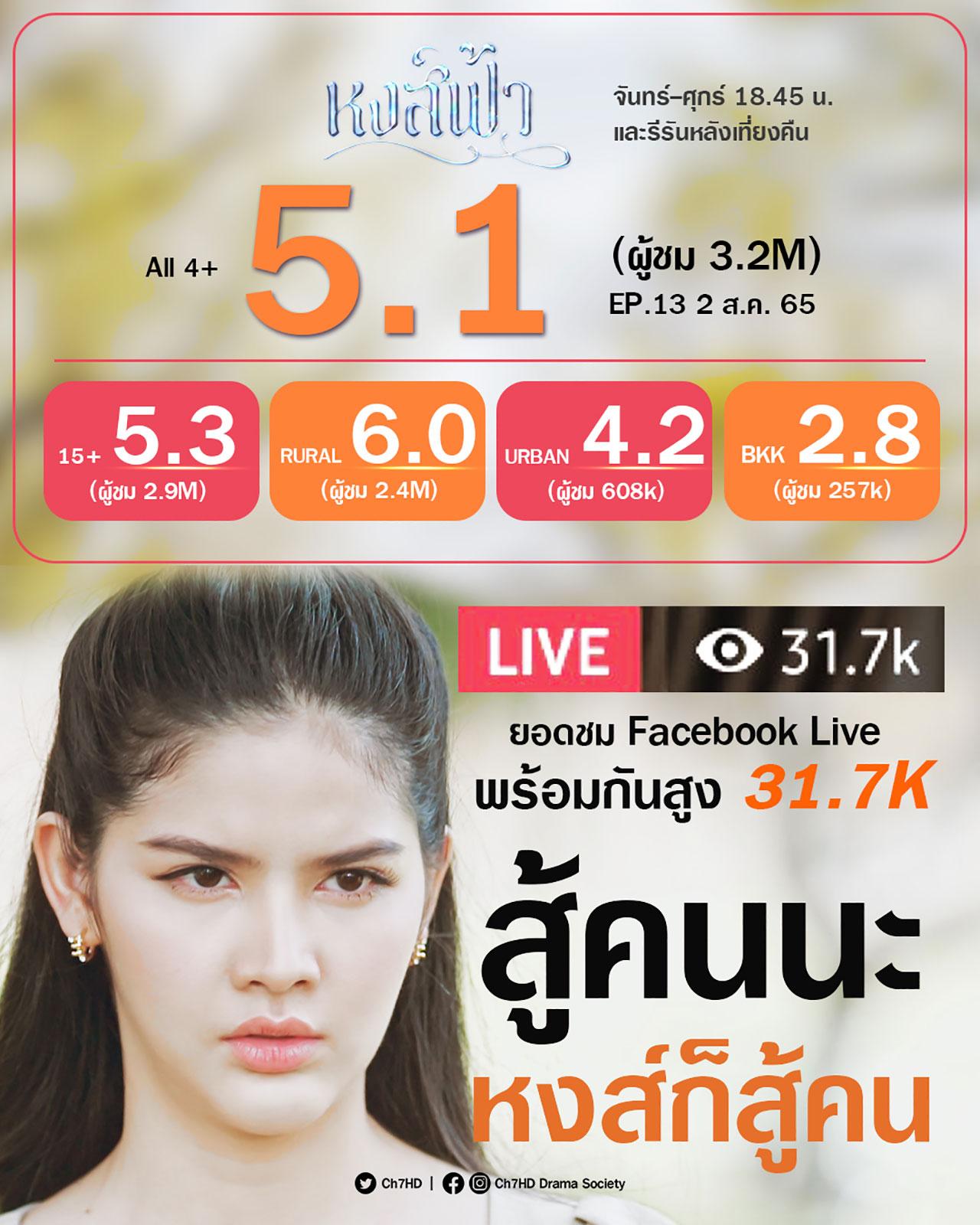 ปังสุดหยุดไม่อยู่แล้วจ้า สำหรับละคร ดราม่าสุดซึ้ง “หงส์ฟ้า” จากค่าย กันตนา มูฟวี่ ทาวน์ (2002) ทาง ช่อง 7HD ที่เรื่องราวเข้มข้นต่อเนื่อง สะกดใจคนดูสุดๆ ล่าสุดฟาดเรตติ้งไปถึง 5.1 ยอดชม FACEBOOK LIVE พุ่งแตะ 31.7K (ข้อมูลวันที่ 2 สิงหาคม 2565)