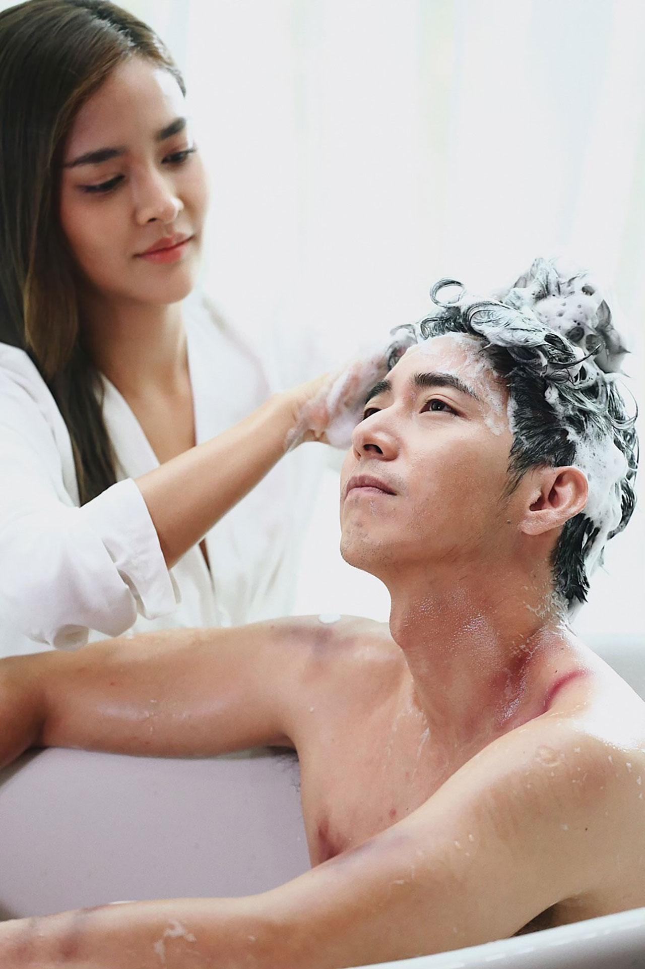 ฉากนี้ ธนาพล ผังดี ผู้กำกับ ย้ำพระนาง ขอฟีลคู่รักข้าวใหม่ปลามัน แบบหยิกแกมหยอก ปุ๊กลุกบอกจัดให้ตามใบสั่ง ด้วยแววตาเจ้าเล่ห์ ทำเอาโตโน่ร้อนๆ หนาวๆ เพราะรู้ทันว่า ปุ๊กลุกคิดไม่ซื่อแน่นอน เริ่มถ่ายจริง โตโน่อาบน้ำด้วยอาการร้าวระบมทั้งตัว เลยส่งสายตา พร้อมน้ำเสียงอ้อนวอน ขอให้ปุ๊กลุกช่วยเป็นมือสระผมให้หน่อย หลังจากทีมงานเติมฟองเต็มหัว ปุ๊กลุกก็หยุมหัว ขยี้สุดแรงมือ จนโตโน่หัวสั่นหัวคลอน ได้เวลาเอาคืน โตโน่สะบัดหัวสุดแรง จนทั้งน้ำ ทั้งฟอง กระเด็นเต็มหน้าปุ๊กลุก