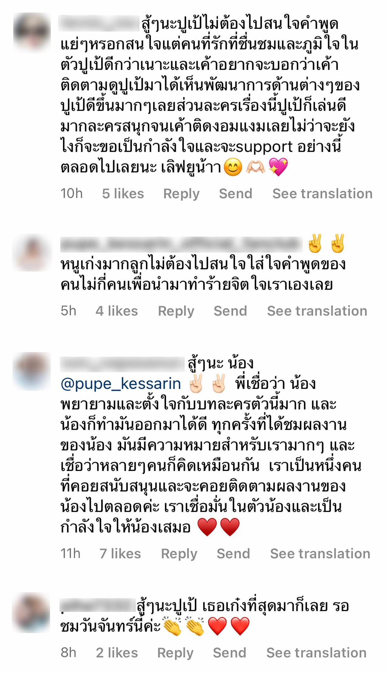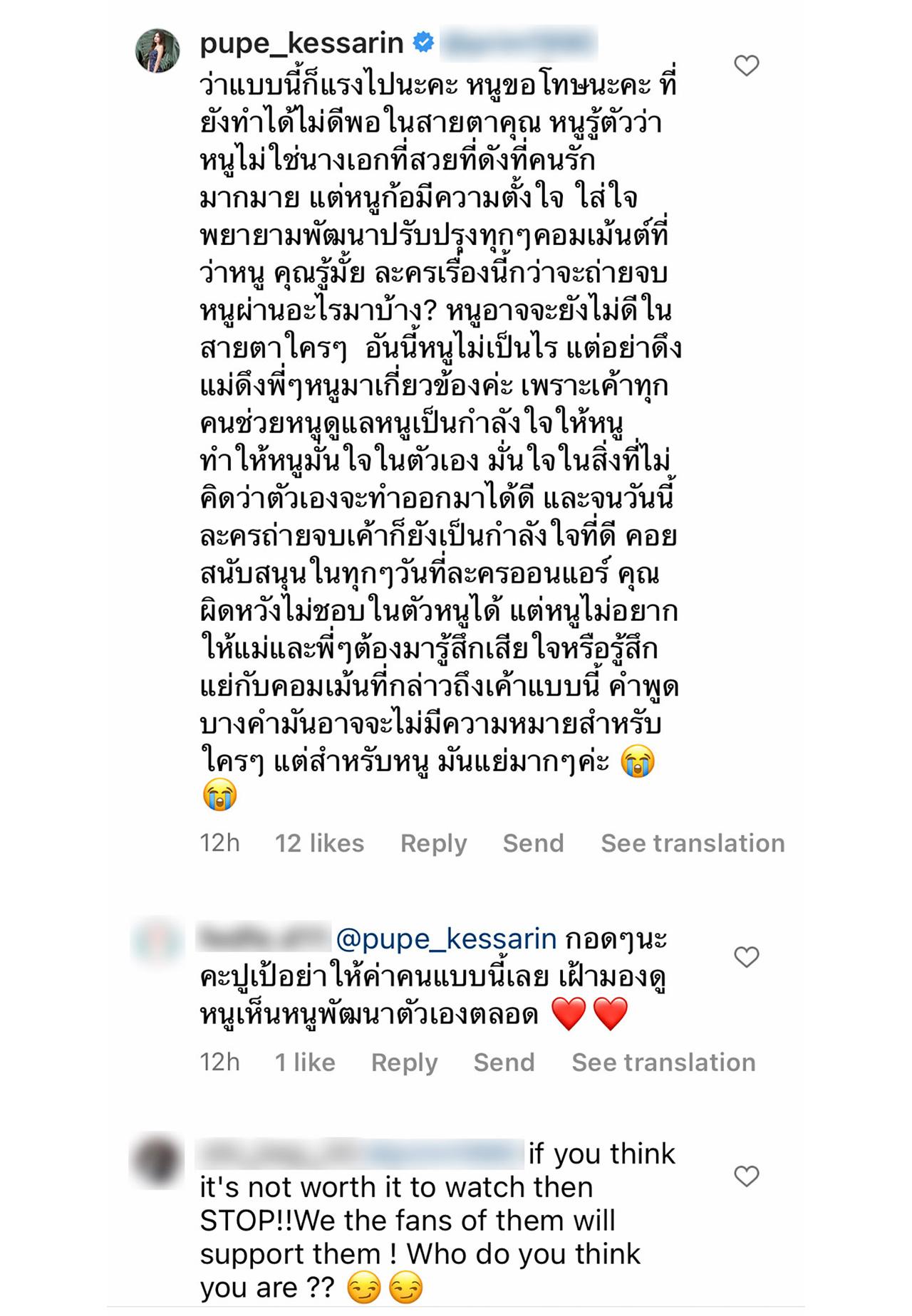 งานนี้ ปูเป้ เกศรินทร์ มาคอมเมนต์ตอบกลับ พร้อมกับเผยความรู้สึก “ว่าแบบนี้แรงไปนะคะ หนูขอโทษนะคะ ที่ยังทำได้ไม่ดีพอในสายตาคุณ หนูรู้ตัวว่าหนูไม่ใช่นางเอกที่สวยที่ดังที่คนรักมากมาย แต่หนูก็มีความตั้งใจใส่ใจ พยายามพัฒนาปรับปรุงทุกๆ คอมเมนต์ที่ว่าหนู คุณรู้มั้ย ละครเรื่องนี้กว่าจะถ่ายจบ หนูผ่านอะไรมาบ้าง? หนูอาจจะยังไม่ดีในสายตาใครๆ อันนี้หนูไม่เป็นไร แต่อย่าดึงแม่ ดึงพี่ๆ หนูมาเกี่ยวข้องค่ะ เพราะเค้าทุกคนช่วยหนู ดูแลหนู เป็นกำลังใจให้หนู ทำให้หนูมั่นใจในตัวเอง มั่นใจในสิ่งที่คิดว่าไม่คิดว่าตัวเองจะทำออกมาได้ดี และจนวันนี้ละครถ่ายจบเค้าก็ยังเป็นกำลังใจที่ดี คอยสนับสนุนในทุกๆ วันที่ละครออนแอร์ คุณผิดหวังไม่ชอบในตัวหนูได้ แต่หนูไม่อยากให้แม่และพี่ๆ ต้องมารู้สึกเสียใจและรู้สึกแย่กับคอมเมนต์ที่กล่าวถึงเค้าแบบนี้ คำพูดบางคำมันอาจจะไม่มีความหมายสำหรับใครๆ แต่สำหรับหนูมันแย่มากๆ ค่ะ”