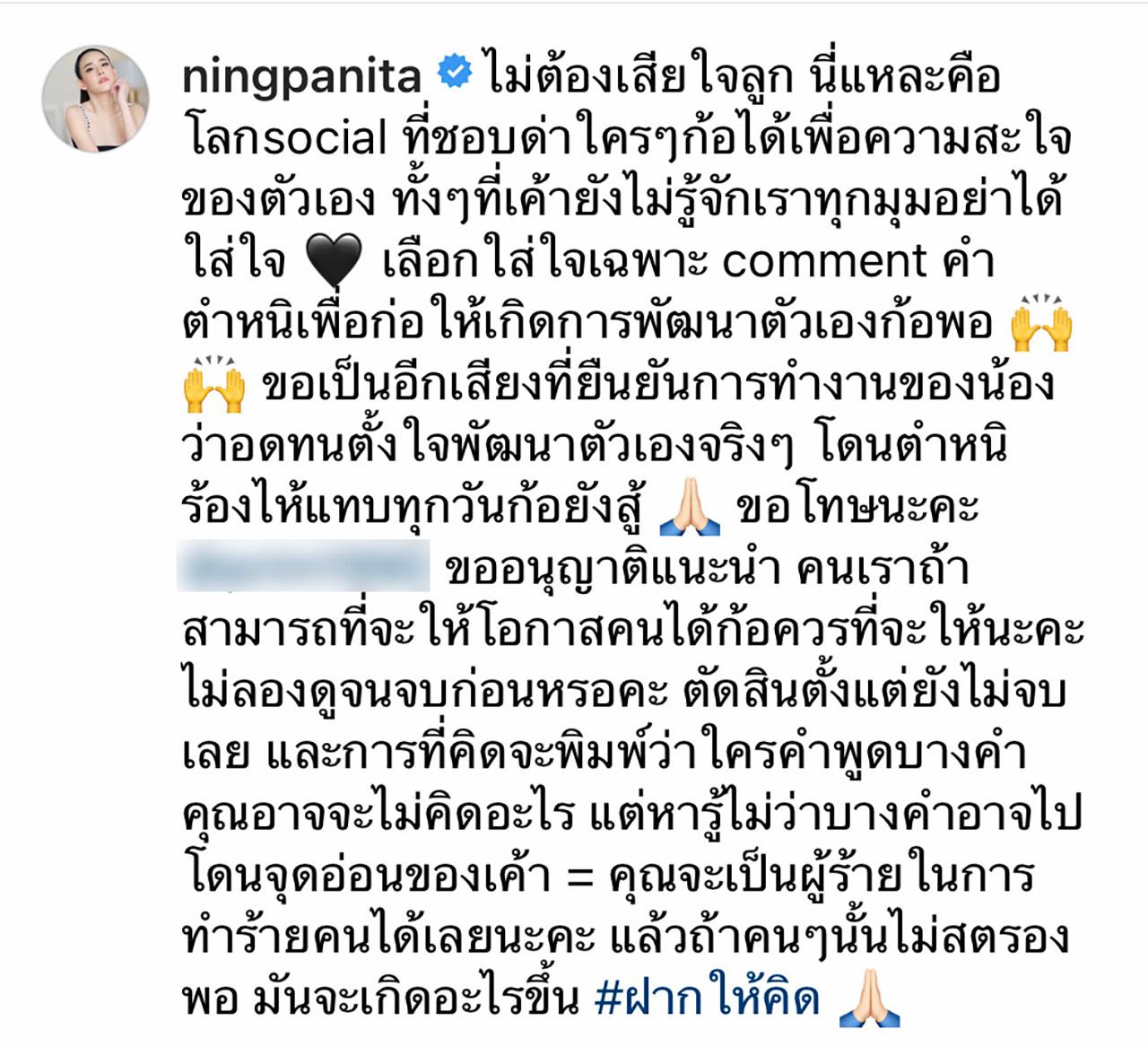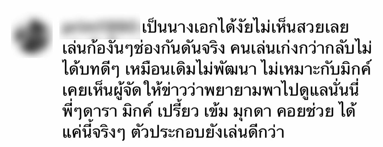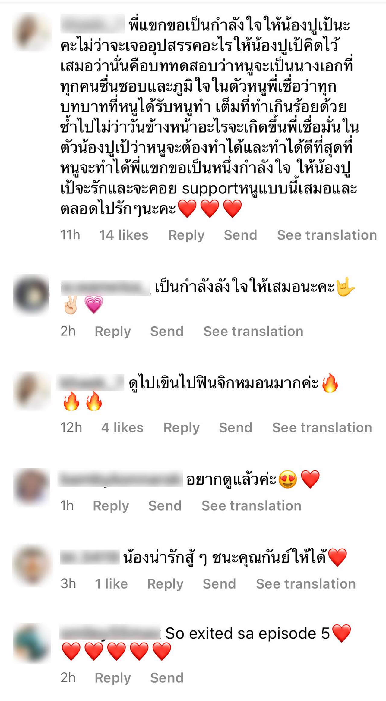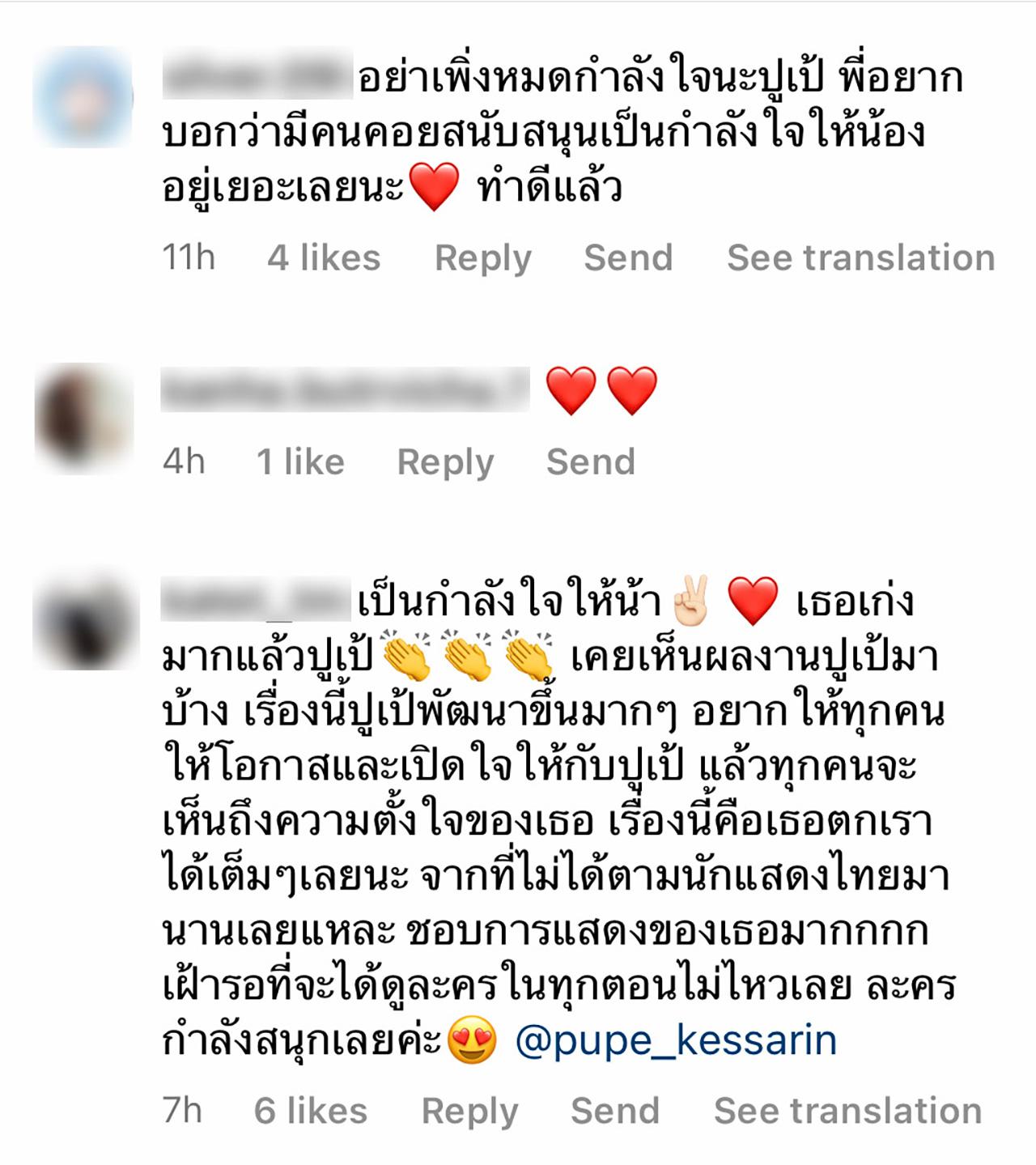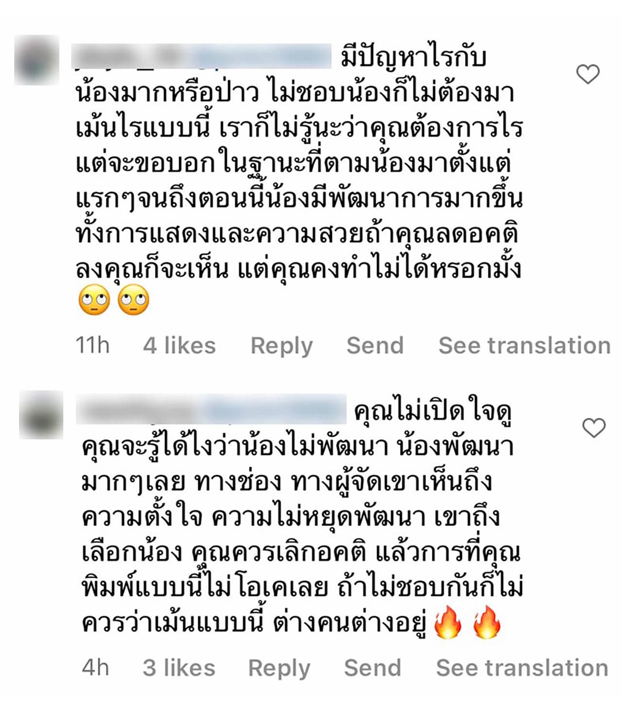 ฟากผู้จัด หนิง ปณิตา, ผู้กำกับ ต่อ ศุภฌา และคนเขียนบท พิไลลาพย์ ต่างเข้ามาคอมเมนต์เช่นกัน ข้อความประมาณว่า ไม่ต้องเสียใจ เลือกใส่ใจเฉพาะคอมเมนต์ที่ติเพื่อก่อและขอเป็นอีกเสียงที่ยืนยันการทำงานของน้องว่าอดทนตั้งใจพัฒนาตัวเองจริงๆ โดนตำหนิร้องไห้ทุกวันก็ยังสู้ ไม่ลองดูจนจบก่อนเหรอคะ งานนี้ยังมีแฟนๆ เข้ามาให้กำลังใจมากมาย โดยอยากให้ “เปิดใจ” ไม่ใช่ “อคติ”