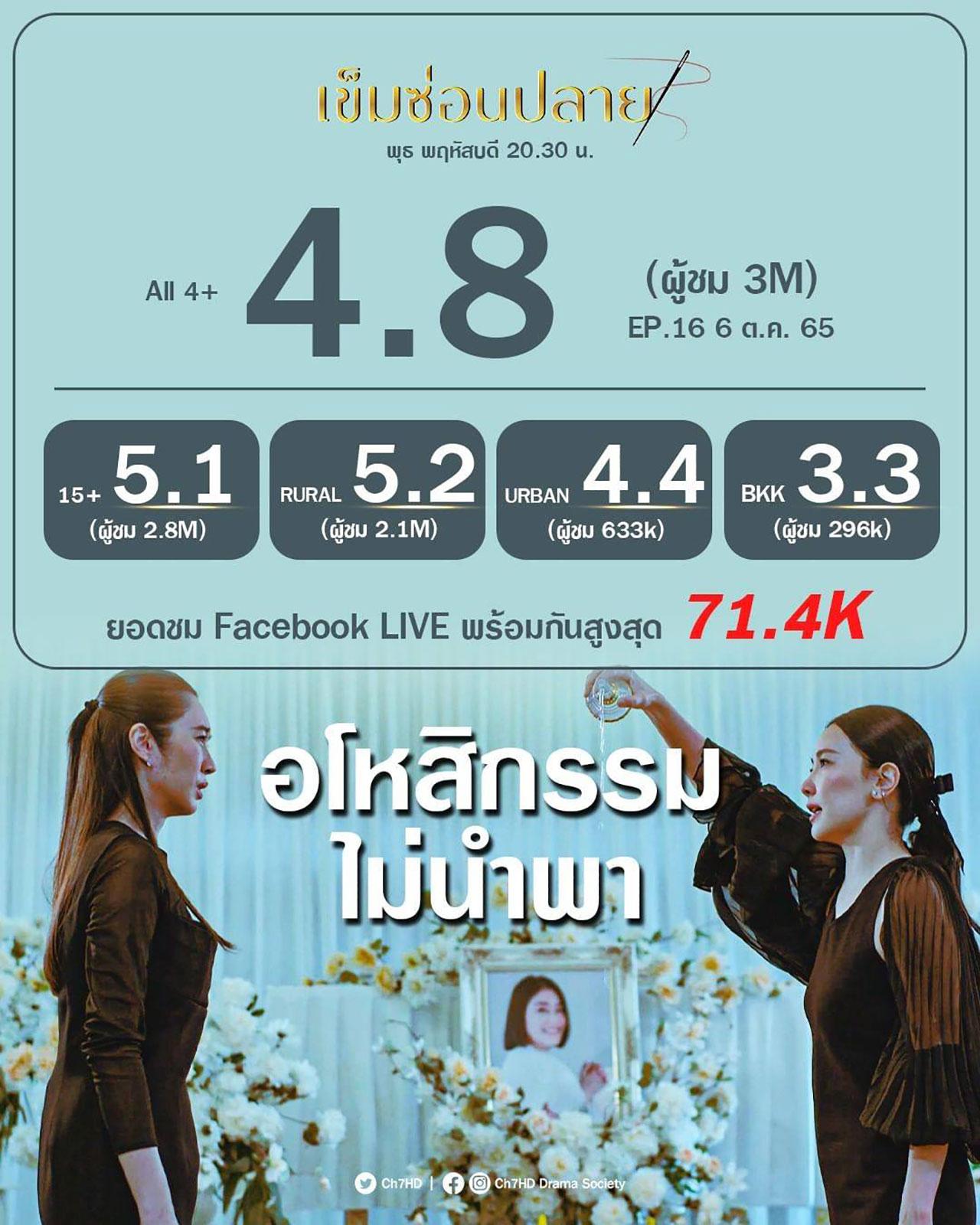 ยิ่งดูยิ่งแซ่บ สำหรับละครเรื่อง “เข็มซ่อนปลาย” ทาง ช่อง 7HD โดยเฉพาะสัปดาห์ล่าสุด ดีกรีความร้ายบท ลานนา ของหนุ่ม บูม-กิตตน์ก้อง ขำกฤษ เริ่มเข้าสู่สายดาร์ก ปล่อยความร้ายไม่กั๊ก ทำเอาเหล่านักแสดง และสองนางเอก นุ่น-วรนุช ภิรมย์ภักดี กับ ฐิสา-วริฎฐิสา ลิ้มธรรมมหิศร ที่ปะฉะดะกันมาหลายอีพี ยังต้องหลีกทางให้ แถมแฟนละครยังพากันถล่มคอมเมนต์สนั่นโซเชียล ทำเรตติ้งสัปดาห์ล่าสุดได้ 4.8 (ข้อมูลวันที่ 6 ตุลาคม 65) และมียอดชม Facebook Live พร้อมกันสูงสุด 71.4K เห็นกระแสแรง ทัวร์แห่ลงขนาดนี้ แต่เจ้าตัวกลับบอกแฮปปี้ ฝากขอบคุณคณะลูกทัวร์มาว่า
