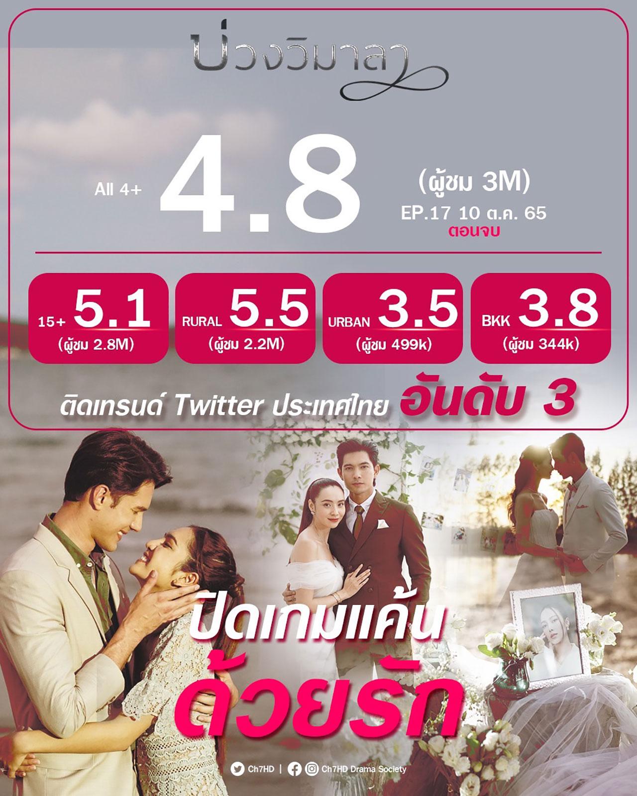 สุดติ่ง เข้มข้น บีบหัวใจ ในตอนจบจริงๆ สำหรับละครดราม่าเข้ม "บ่วงวิมาลา" ค่าย นีโน่ บราเดอร์ส นำแสดงโดย มิกค์ ทองระย้า, เปรี้ยว ทัศนียา การสมนุช และ ปูเป้ เกศรินทร์ น้อยผึ้ง ที่เรียกว่าจบได้สวยงาม คว้าเรตติ้งตอนจบที่ 4.8 พร้อมกับแฮชแท็ก #บ่วงวิมาลาตอนจบ ก็ติดเทรนด์ทวิตเตอร์ประเทศไทย อันดับ 3 ไปด้วย งานนี้ 3 นักแสดงนำ มิกค์, เปรี้ยว และ เป้ เป็นปลื้ม ขอเป็นตัวแทนขอบคุณ และฝากความในใจถึงแฟนละคร