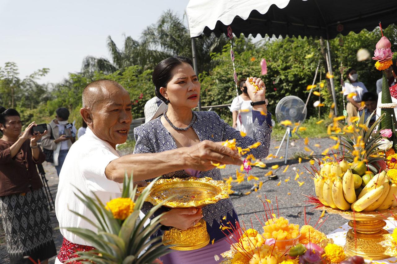 โดยผู้จัด กล้วย-ปรารถนา สัชฌุกร และ รอน บรรจงสร้าง ผู้กำกับ พร้อมด้วยทีมนักแสดง กั้ง-กรณ์ ศิริสรณ์, ไข่มุก-รุ่งรัตน์ เหม็งพานิช, กัปตัน-ภูธเนศ หงษ์มานพ, สุนารี ราชสีมา, น้ำผึ้ง-ณัฐริกา ธรรมปรีดานันท์, เต๋า ภูศิลป์, มีนตรา อินทิรา, โตโต้ (The golden song), ดอกอ้อ ทุ่งทอง, ปอยฝ้าย มาลัยพร ฯลฯ ทำพิธีบวงสรวงเพื่อเอาฤกษ์เอาชัยก่อนละครออนแอร์ โดยบรรยากาศภายในงานเหล่านักแสดงต่างตั้งใจส่งจิตอธิษฐานขอพรให้เรตติ้งละครซิ่นลายโส้พุ่งกระฉูด ปังๆ!! กันอย่างพร้อมเพรียง ก่อนจะจบงานด้วยความอิ่มอกอิ่มใจและราบรื่นไปด้วยดี ณ สตูดิโอ คลอง 8 จ.ปทุมธานี