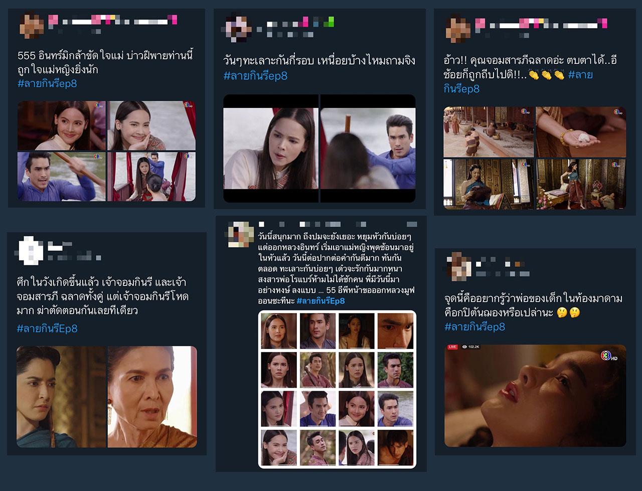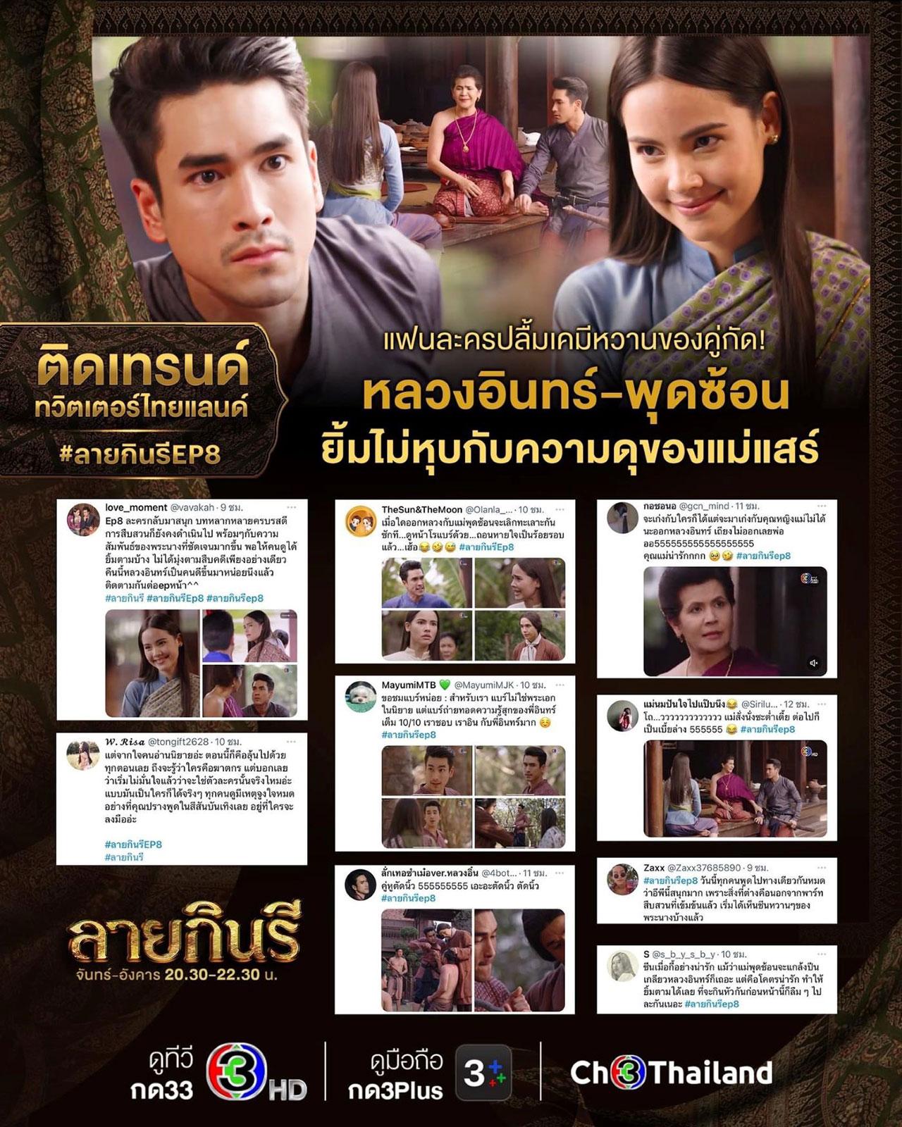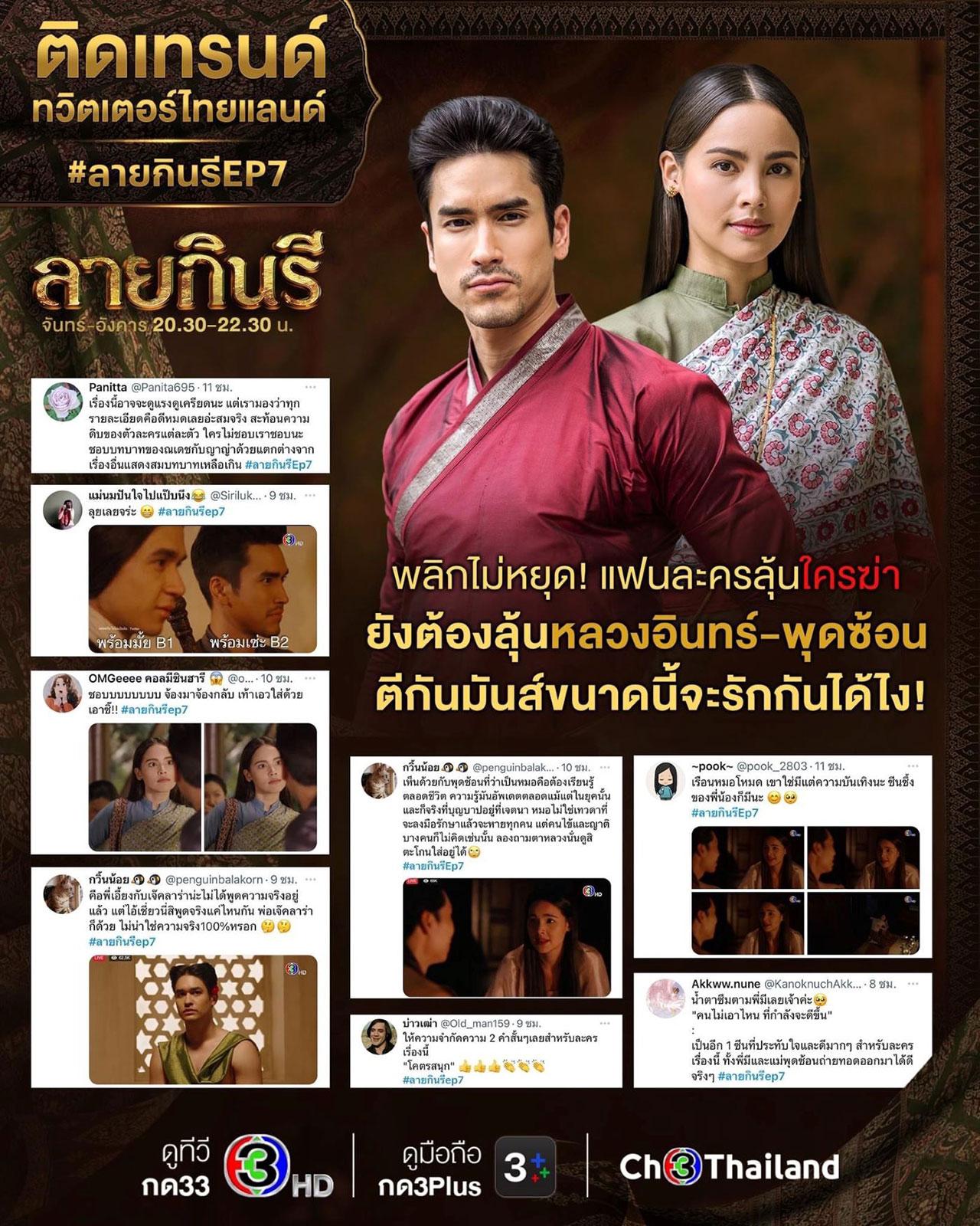 ฟากฝั่งในวัง เจ้าจอมกินรี (พิ้งกี้ สาวิกา) กับ ช้อย (ปู ปริศนา) ก็พยายามเอาผ้าลายอย่างคืนถึงขั้นฆ่าคนตาย แต่กลับไม่ได้คืนเพราะ เจ้าจอมสารภี (เจี๊ยบ กาญจนาพร) คิดแผนตลบหลัง คนดูพากันปรบมือให้กับความฉลาดของเจ้าจอมสารภีรัวๆ เรื่องราวในละครสนุกพลิกไปพลิกมา ได้กระแสตอบรับที่ดีจากแฟนๆ โซเชียลทั้งหลาย จน #ลายกินรีep7 และ #ลายกินรีep8 ติดเทรนด์ทวิตเตอร์ไทยแลนด์