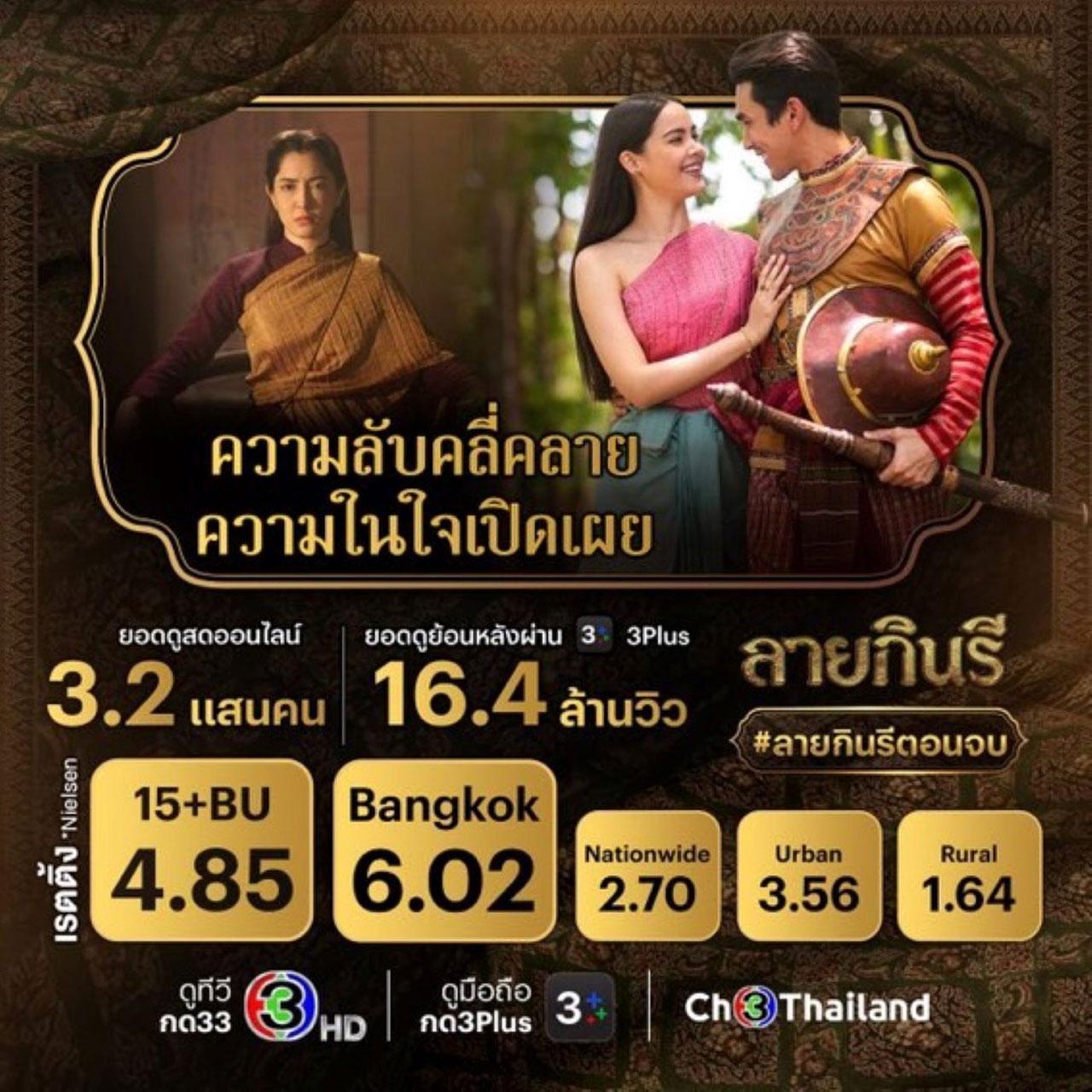ปิดคดีใหญ่แห่งอโยธยาได้น่าขนลุกมาก สำหรับละคร “ลายกินรี” ช่อง 3 คนดูถึงกับปรบมือสาดคำชมรัวๆ ให้กับฝีมือการแสดงของนักแสดงทุกคนในเรื่องนี้ โดยเฉพาะสาว “พิ้งกี้ สาวิกา” ที่ใน 2 ตอนสุดท้ายของเรื่องโชว์ฝีมือการแสดงได้ดีจนคนดูขนลุกกับบทบาทของ “เจ้าจอมกินรี” ผู้ที่อยู่เบื้องหลังการตายของ กปิตันฌอง และทุกคนในเรื่องเพราะความมักใหญ่ใฝ่สูงของเธอ บอกเลยว่าในตอนอวสานของเรื่องคนดูต่างพากันตั้งอกตั้งใจลุ้นไปกับการปิดคดีเคลียร์ปมที่คาใจคนดูมานาน จนทำให้ยอดดูสดออนไลน์ตอนจบพุ่งแรงถึง 3.2 แสนคน และยอดคนดูย้อนหลังผ่าน 3Plus กว่า 16.4 ล้านวิว แถมตัวเลขเรตติ้งกลุ่มผู้ชมอายุ 15 ปีขึ้นไป กลุ่ม (Bangkok and Urban) หรือ 15+ BU ไปได้ 4.85 และเรตติ้งใน Bangkok สูงถึง 6.02 ส่วน #ลายกินรีep15 และ #ลายกินรีตอนจบ ก็ยังติดเทรนด์ทวิตเตอร์ไทยแลนด์อีกด้วย