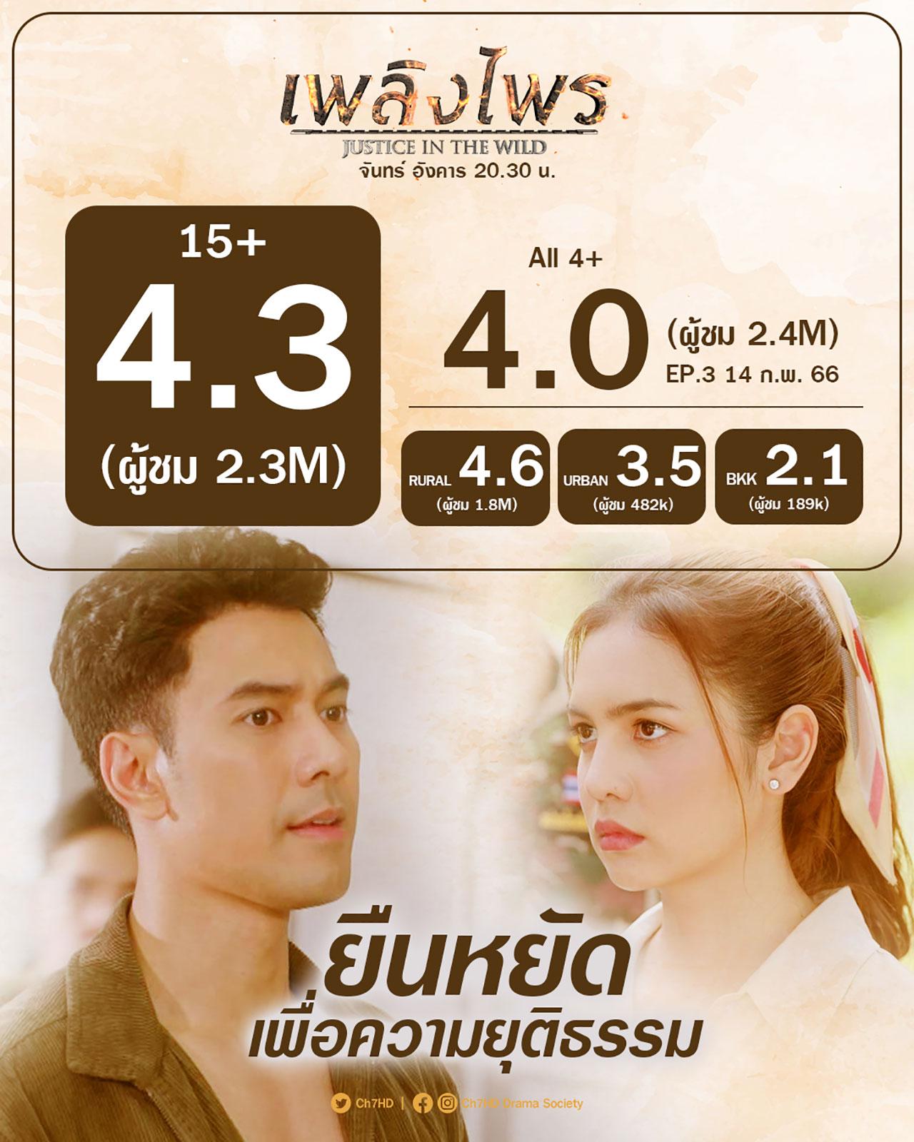 เข้าสู่สัปดาห์ที่สอง ของละครแอ็กชั่นดราม่าเรื่อง “เพลิงไพร” จากค่าย มีเดีย สตูดิโอ แล้ว กระแสตอบรับจากแฟนละคร ช่อง 7HD ยังแรงไม่ตก ทุกคนพูดเป็นเสียงเดียวกันว่า ละครน้ำดี ครบรส บทสะท้อนสังคม เรียกว่าโดนใจ น่าติดตาม จนทำเรตติ้ง 15+ ทั่วประเทศได้ 4.3 (ข้อมูลวันที่ 14 กุมภาพันธ์ 2566)