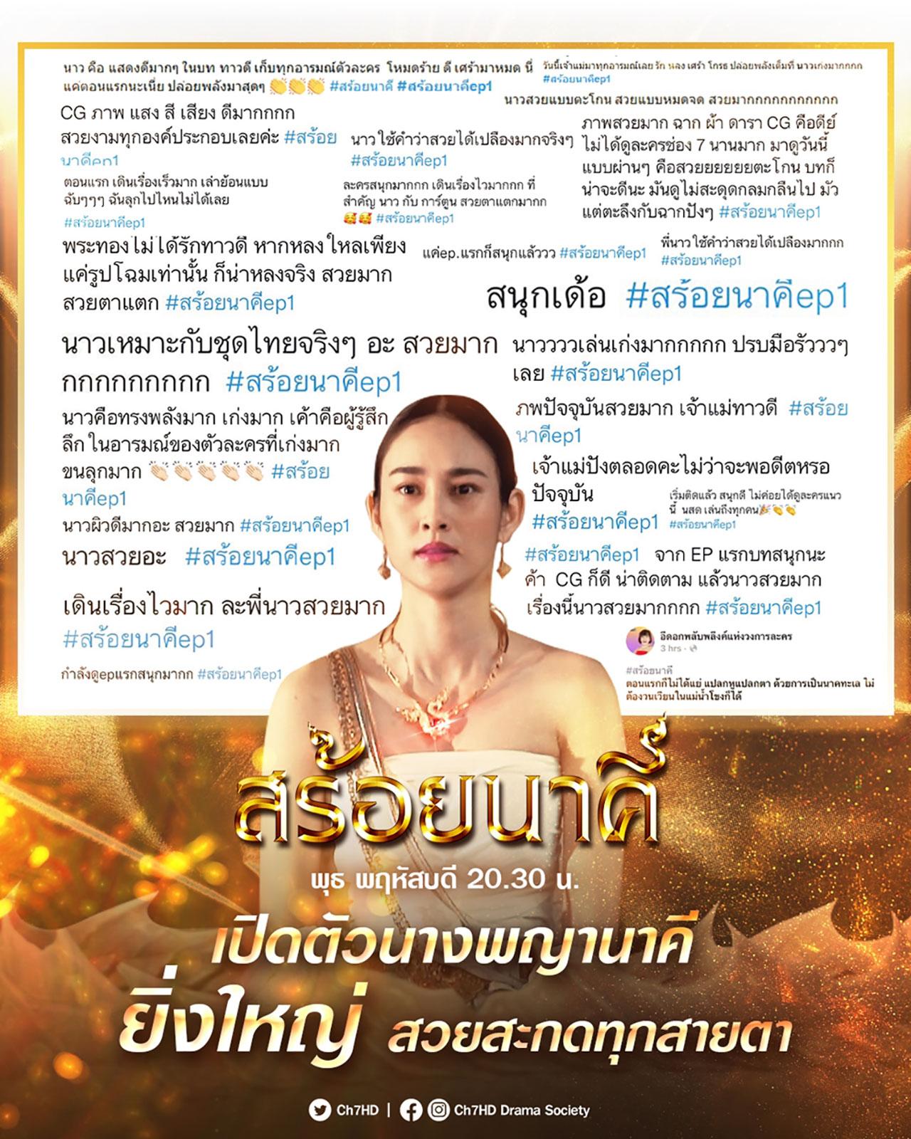 เปิดฉากตอนแรกอย่างเร้าใจ เดินเรื่องไว สนุกสมการรอคอยจริงๆ กับละครดราม่าแฟนตาซีแห่งปี "สร้อยนาคี" ทางช่อง 7HD การันตีความเข้มข้นโดยค่ายคุณภาพ "มุมใหม่" ที่สร้างปรากฏการณ์เรตติ้งวันเปิดตัว 15+ ทั่วประเทศได้ถึง 4.3 (ข้อมูลวันที่ 23 กุมภาพันธ์ 2566) โดย นาว ทิสานาฏ ศรศึก ที่งานนี้สวมบท "ทาวดี" นางพญานาคี สตาร์ตตอนแรกก็ได้รับกระแสในโซเชียลทันทีว่า อินเนอร์แรงแถมสวยสะกดทุกสายตา ขอเปิดใจขอบคุณแฟนละครและพูดถึงเสียงตอบรับในช่องทางต่างๆ ว่า