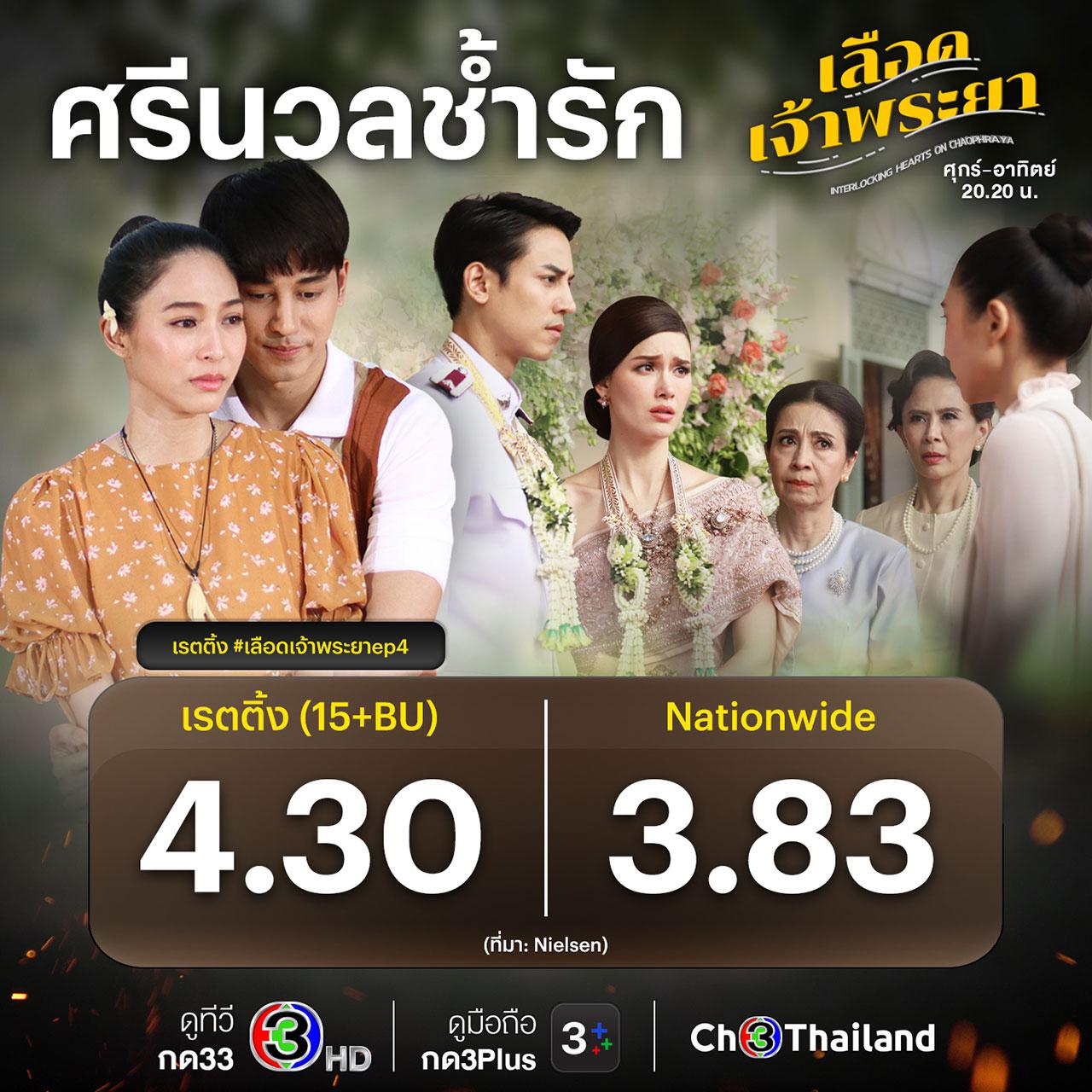 ยิ่งดูยิ่งติดกับละครครบรส “เลือดเจ้าพระยา” ทางช่อง 3 จากค่าย อาหลอง จูเนียร์ หลังทีมรุ่นใหญ่อย่าง เด่นคุณ งามเนตร, บูม สุภาพร, ป๊อป ฐากูร และ ตั๊ก นภัสกร ที่ต้องลุกขึ้นยืนปรบมือชมแบบงามๆ กับฝีไม้ลายมือที่ฟาดฟันไม่ยั้ง ปล่อยหมัดจัดเต็มทั้ง ดราม่า แอ็กชั่น ที่แต่ละคนเล่นใหญ่จัดเต็ม จนคนดูลุ้นจนแทบหยุดหายใจ จนพาเรตติ้งรวมใน อีพี 4 ไปได้มากถึง 3.83 ในส่วนพื้นที่กรุงเทพฯ ทำไปได้ 4.167 ตามมาด้วยกลุ่มผู้ชมอายุ 15 ปีขึ้นไป กลุ่ม (Bangkok and Urban) หรือ 15+ BU ที่พุ่งไปมากถึง 4.30 งานนี้รีโมตมีลุกเป็นไฟ