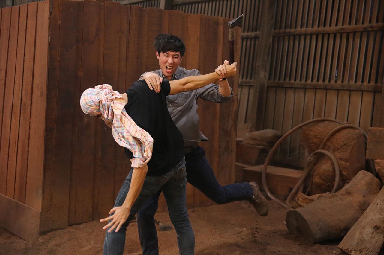 ฉากนี้ถ่ายทำกันที่โรงเลื่อยจักรไทยนำแสง จ.ปทุมธานี เบื้องหลังบอกเลยว่ามีแอบเสียว กับฉากที่ยูโดกับป๊อปต้องอยู่บนท่อนซุง แค่ตอนจับมัดนอนให้ทั้งคู่พยุงตัวเองอยู่ยังยากกลัวจะกลิ้งตกลงมาซะก่อน เพราะท่อนซุงใหญ่มากแถมอยู่บนล้อเลื่อนทำให้เพิ่มความสูงเข้าไปอีก แต่ที่น่าตื่นเต้นไปกว่านั้นคือตอนที่ล้อเลื่อนกำลังเคลื่อนที่ไปที่ใบเลื่อยจริงๆ ถึงแม้หนุ่มยูโดจะแอบกลัวเพราะขาของตัวเองหันไปทางใบเลื่อยแต่ก็ยังมีสมาธิกับการแสดง ส่วนเหล่าทีมงานนั่งเกร็งลุ้นไปตามๆ กัน