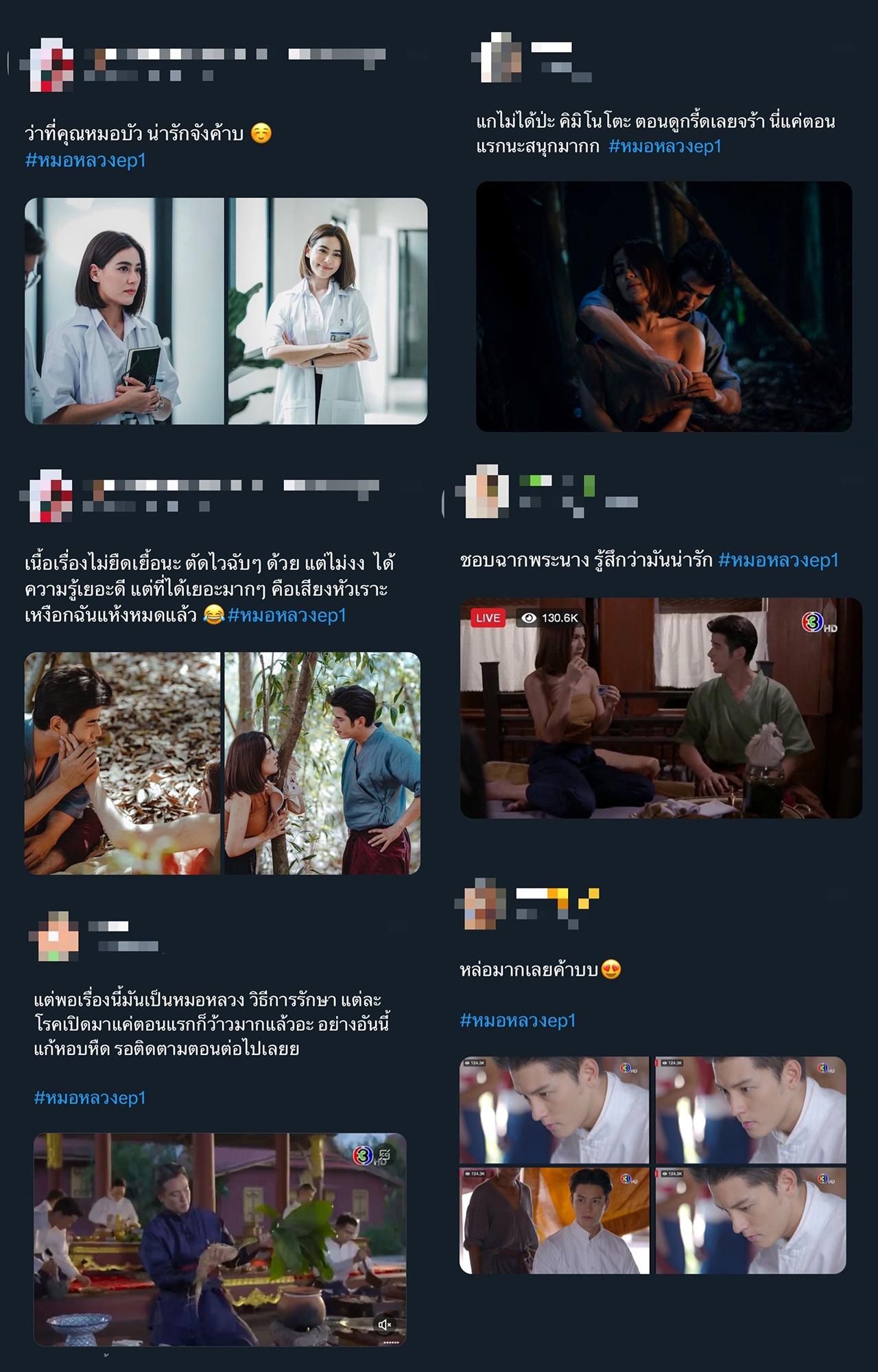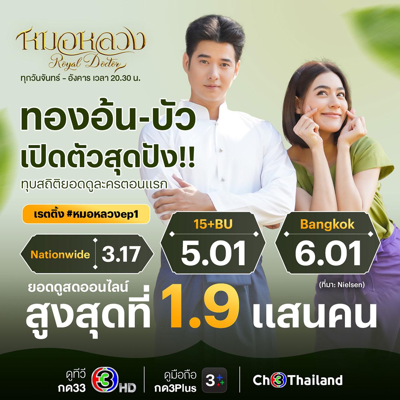 กลายเป็นละครอีกหนึ่งเรื่องที่ยึดพื้นที่ในใจคนดูไปซะแล้ว สำหรับละคร “หมอหลวง” ช่อง 3 ผลงานของผู้จัดผู้กำกับ “ชุ ชุดาภา” และผู้จัด “ก้อง ปิยะ” แห่งบริษัท โซนิกซ์ บูม 2013 จำกัด เรียกว่าขึ้นแท่นคว้าความปังตั้งแต่ละครออนแอร์ตอนแรกเลยทีเดียว เพราะไหนจะยอดคนดูออนไลน์ที่พุ่งแรงทะลุหลักแสนตั้งแต่เบรกแรก จนทำให้ #หมอหลวงep1 สนั่นโซเชียลถึงขั้นติดเทรนด์ทวิตเตอร์ไทยแลนด์อันดับ 3 ไปเลยจ๊ะ และแน่นอนว่าตัวเลขเรตติ้งละคร “หมอหลวง” EP.1 ก็ไม่ธรรมดาปังกระฉูดไม่แพ้กัน ได้เรตติ้งกลุ่มผู้ชมอายุ 15 ปีขึ้นไป กลุ่ม (Bangkok and Urban) หรือ 15+ BU ไปได้ 5.01 และเรตติ้งใน Bangkok ทำสูงถึง 6.01