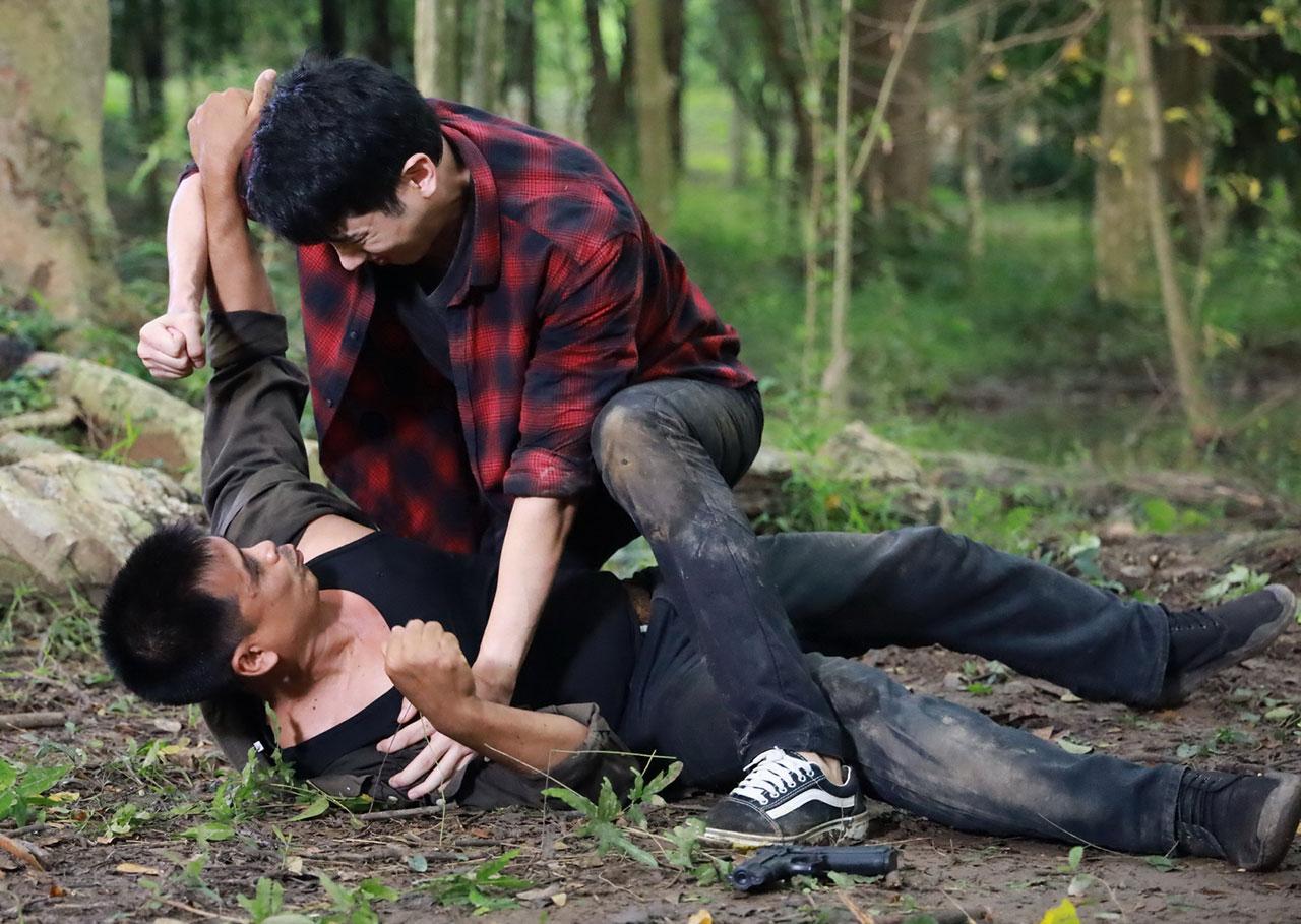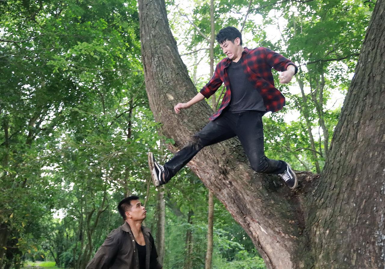 ต่อสู้ท้ายกระบะแค่จิ๊บๆ ก่อนจะไปต่อชุดใหญ่บนเนิน ล้มกลิ้งวิ่งไปลื่นล้มไปจากพื้นชุ่มน้ำฝน ทีมงานจะให้พักเหนื่อยก่อน แต่ แชป บอก “ลุยถ่ายยาวไปเลยครับ เลอะเป็นปกติฉากต่อเนื่องอยู่แล้ว” แชป หนีตายขึ้นไปตั้งหลักบนต้นไม้..ครั้งแรกกับการสู้จากที่สูงตื่นตาตื่นใจมุมเบิร์ดอายวิวไม่นานก็ดูระยะปะทะ คัตนี้ แชป ต้องกระโดดถีบคนร้ายที่ตามมาด้านล่าง วันนี้เรียกว่าสู้มาราธอนไม่เข้มข้นเราไม่เลิก แชป บอก “ผมชักจะติดใจคิวบู๊แล้วนะ ยิ่งเล่นก็ยิ่งมัน”