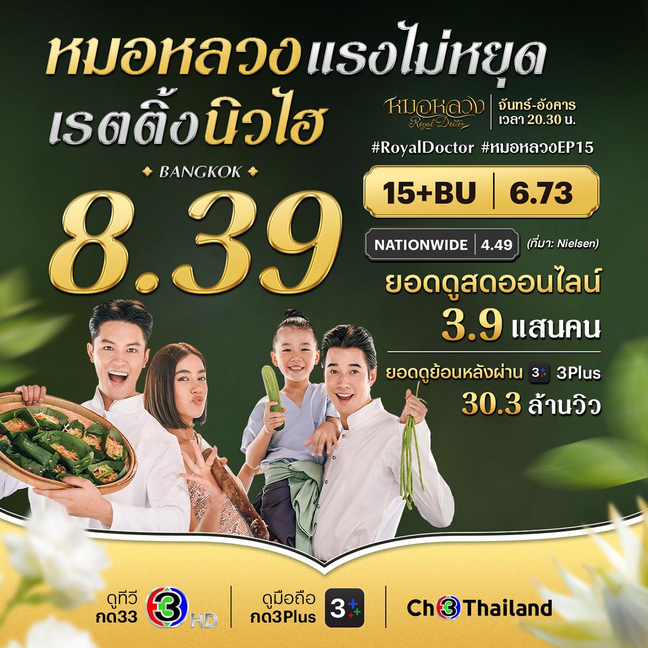 แต่ที่รู้แน่ๆ จนสะเทือนทั้งแผ่นดิน เพราะเรตติ้งละครนำ 1 ทุกอีพี ตอนล่าสุดของ “หมอหลวง EP.15” คว้าเรตติ้งกลุ่มผู้ชมอายุ 15 ปีขึ้นไป กลุ่ม (Bangkok and Urban) หรือ 15+ BU ได้ 6.73 เรตติ้งใน Bangkok พีกสะเทือนวงการสูงถึง 8.39 และเรตติ้ง NATIONWIDE ทำได้ 4.49 จากนั้นยังมียอดดูย้อนหลังผ่านแอปพลิเคชัน 3Plus พุ่งถึง 30.3 ล้านวิว ปังจริงไม่มีมโนนะจ๊ะ