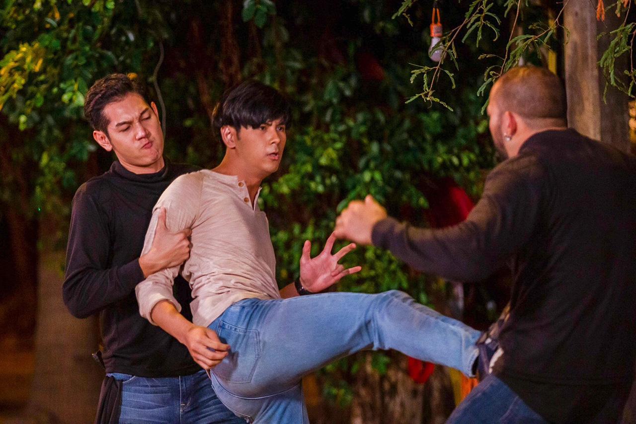 ฉากนี้เป็นฉากที่ ผจญ (ซิล-ฐณธรณ์) เดินมาส่ง วันวิสา (กิฟท์-สุพิชฌาย์) ที่ร้านกาแฟ และขอตัวกลับบ้าน ซึ่งในระหว่างทางลูกน้อง เสี่ยจิว (กฤตย์ อัทธเสรี) ที่ปลอมตัวเป็นโจรไล่ปล้นคนในบ้านปากอ่าวนาง เพื่อหวังทำลายชื่อเสียงของ กำนันธง (หนุ่ม-สันติสุข) ให้หมดความน่าเชื่อถือในสายตาชาวบ้าน ก็เข้ามาปล้นผจญด้วย ผจญต่อสู้กับพวกโจรและพลาดโดนแทงเข้าที่ท้อง ทางด้านวันวิสาก็ผิดสังเกตที่ผจญยังไม่โทรหาเธอสักที โทรไปก็ไม่รับ จึงสงสัยออกตามหาไปเจอผจญนอนบาดเจ็บอยู่
