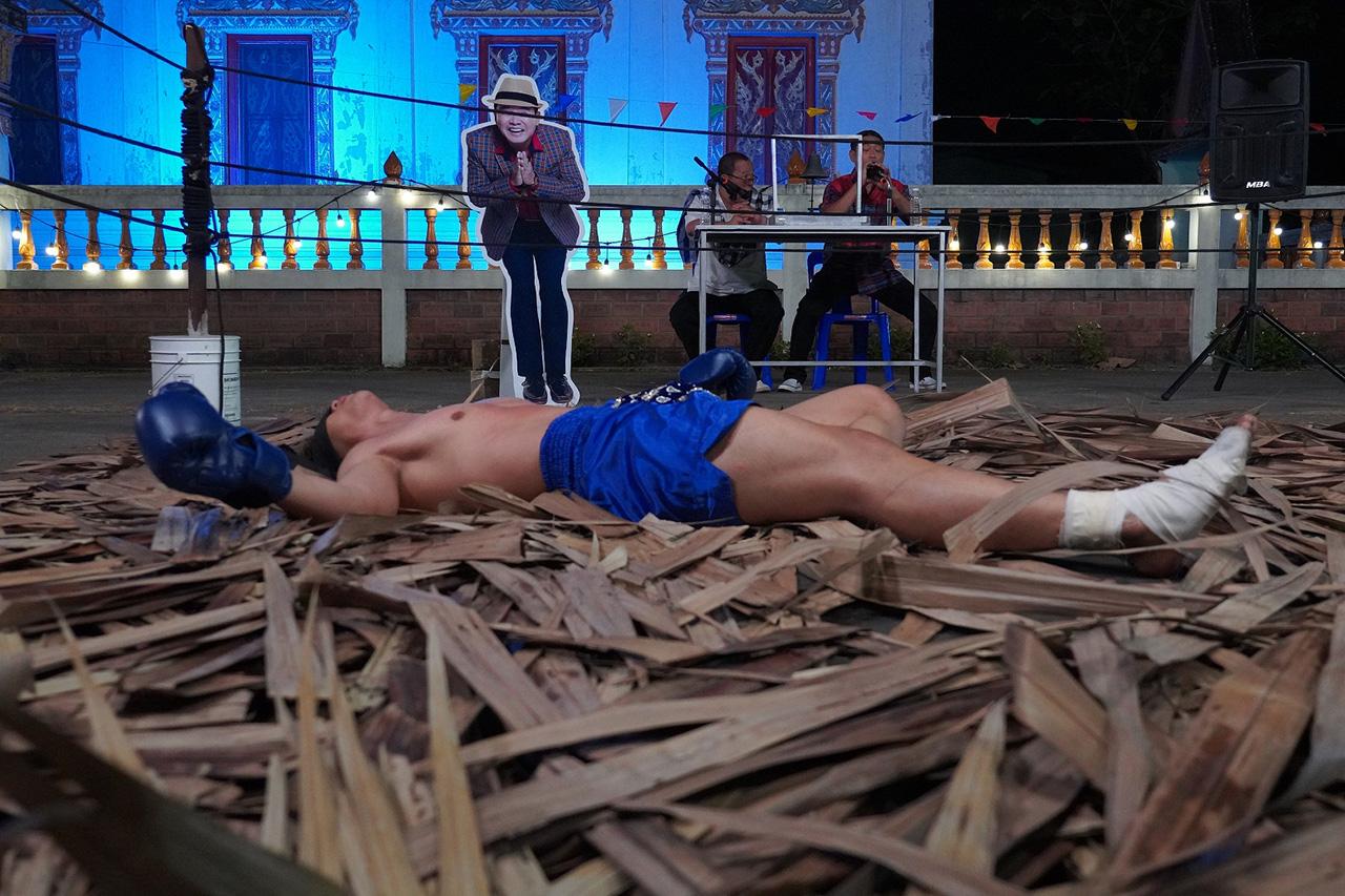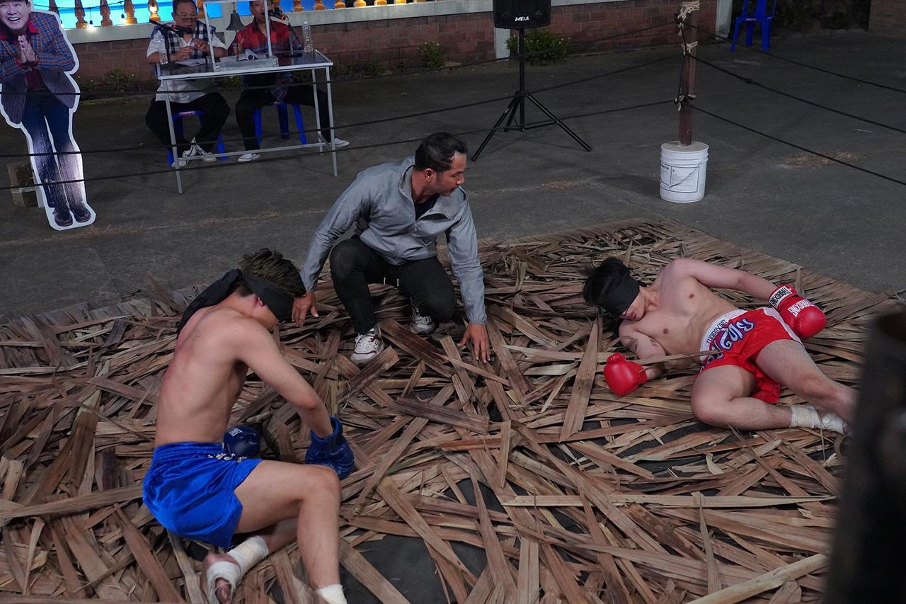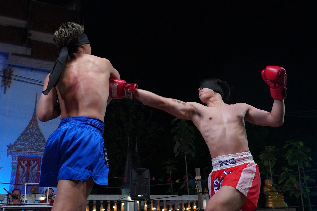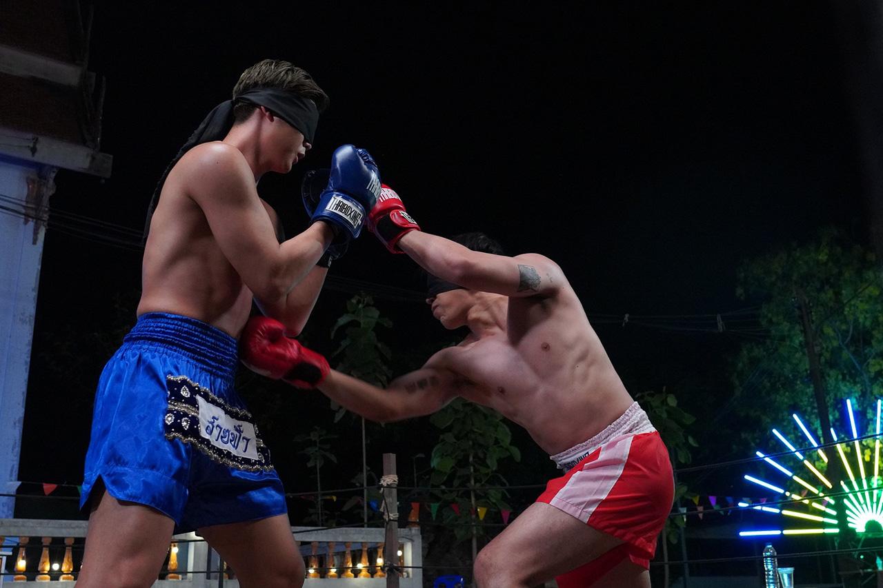ฉากนี้เป็นฉากที่ สายฟ้า (ตะวัน) มือใหม่ในวงการมวยต้องลงแข่งขันชกเปิดสังเวียนกับ เปเล่ (ไกด์) ลูกศิษย์ค่ายมวยของ สาหัส (สามารถ พยัคฆ์อรุณ) ซึ่งกติกาชกคือต้องใช้ผ้าปิดตาให้สนิท โดยการต่อยคือใครต่อยเข้าเป้ามากที่สุดจะเป็นฝ่ายชนะ งานนี้โค้ชคนสำคัญอย่าง เปรี้ยว (ธัญญ่า) และ เจ้า (รัศมีแข ฟ้าเกื้อล้น) ยืนให้กำลังใจสายฟ้าไม่ห่างเพราะชัยชนะครั้งนี้แลกกับเงินก้อนโต อีกฟากหนึ่ง วารี (ตังเม เมธาวี) และ เมธัส (ปอ อรรณพ) ก็ต่างส่งเสียงเชียร์ตลอดเวลา