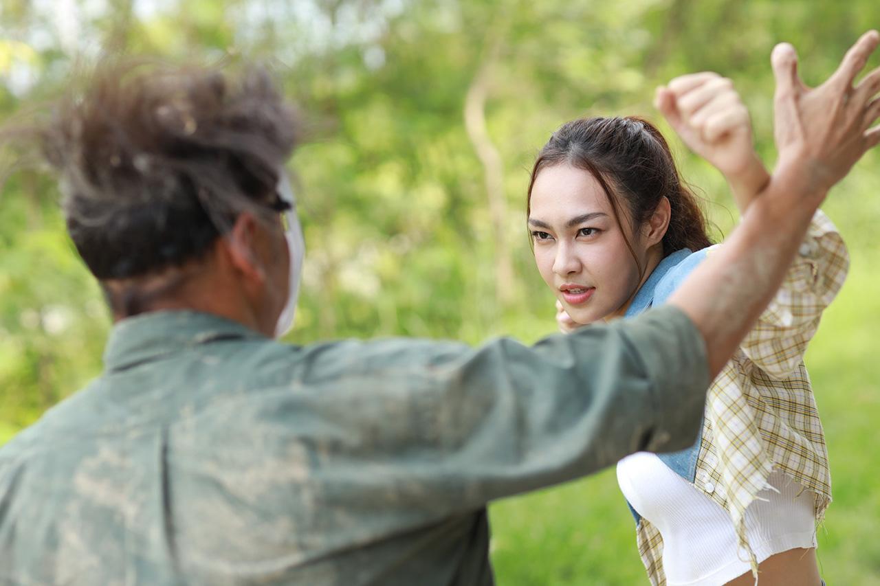 ฉากนี้เป็นฉากที่ แม่มน (ลูกน้ำ-พาเมล่า) ให้ ปู (สไมล์-ศศินา) กับ นนท์ (โหน-ธนากร) ออกไปรับลูกค้ามาที่รีสอร์ต ซึ่งระหว่างทางทั้งคู่ก็โดนลูกน้องของ เสี่ยจิว (กฤตย์ อัทธเสรี) ดักเอาตะปูไปโรยถนนทำให้ยางรถของปูแตกไปต่อไม่ได้ และจะลอบทำร้ายทั้งคู่ งานนี้ทั้งปูและนนท์แท็กทีมสู้ไม่ถอย แต่ก็พลาดพลั้งปูโดนจับไปเป็นตัวประกัน