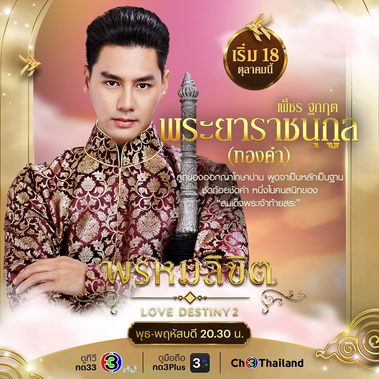 จาก “บุพเพสันนิวาส” ถึง “พรหมลิขิต” ทางช่อง 3 ผลงานของผู้จัด “หน่อง อรุโณชา ภาณุพันธุ์” แห่งค่าย “บรอดคาซท์ ไทย เทเลวิชั่น” นำแสดงโดยพระนางคู่ขวัญ โป๊ป ธนวรรธน์ และ เบลล่า ราณี ซึ่งนอกจาก “โป๊ป-เบลล่า” แล้ว ยังมีนักแสดงชุดเดิมจาก “บุพเพสันนิวาส" กลับมาสร้างสีสันกันครบทีม รวมถึงตัวละครใหม่ที่เปิดตัวมาเรียกเสียงฮือฮาอีกมากมาย พาไปรู้จักยอดนักบู๊แห่งอยุธยา เพ็ชร ฐกฤต ตวันพงค์ รับบทเป็น พระยาราชนุกูล (ทองคำ) และ โอม คณิน สแตนลีย์ รับบทเป็น หลวงชิดภูบาล (ยอร์ช ฟอลคอน)