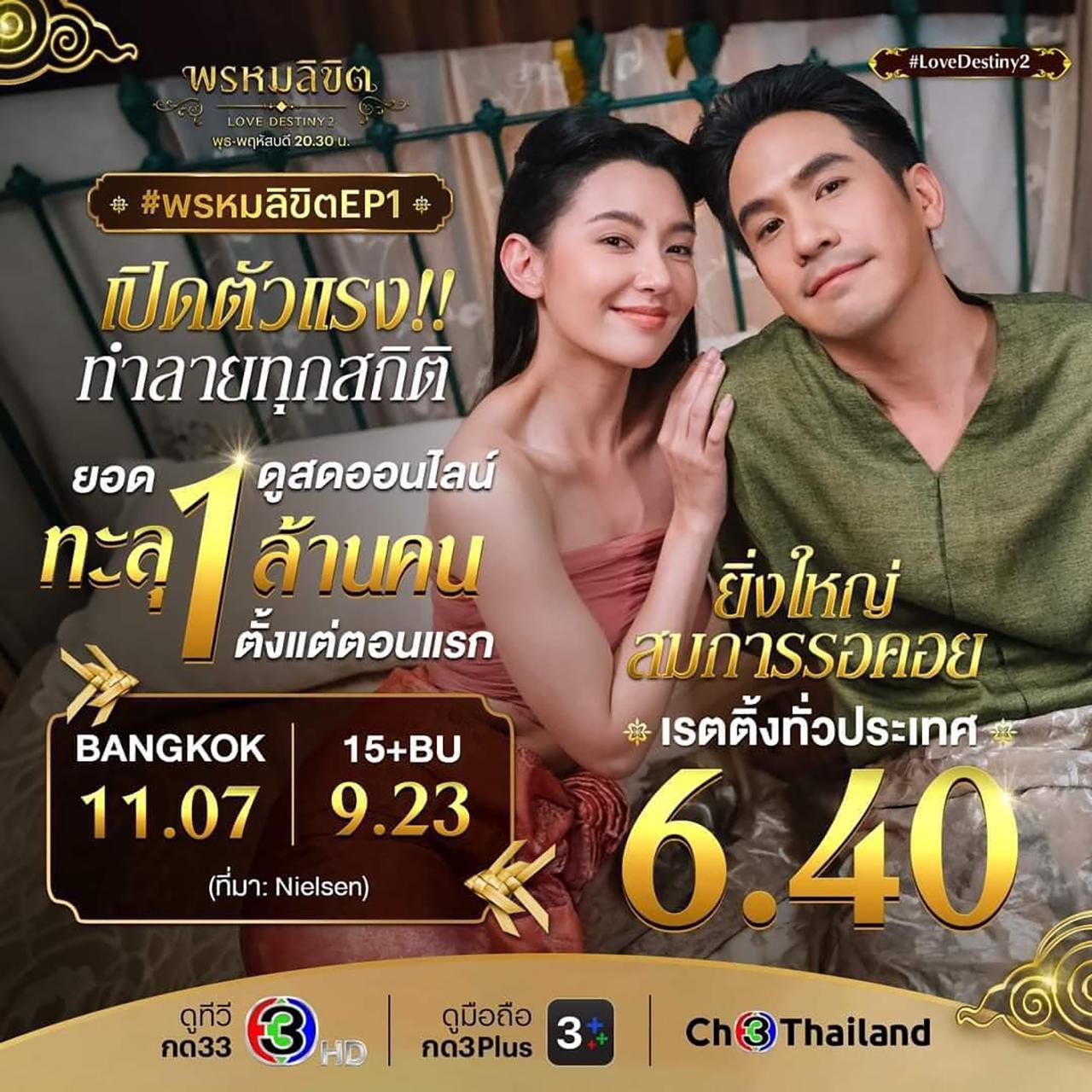 ลงจอตอนแรกกันไปเรียบร้อยแล้วสำหรับละคร “พรหมลิขิต” ภาคต่อของละคร “บุพเพสันนิวาส” ที่ได้พระนางคู่จิ้นสุดฮอต “คุณพี่หมื่น” ที่รับบทโดย โป๊ป ธนวรรธน์ กับ “คุณหญิงการะเกด” ที่รับบทโดย เบลล่า-ราณี เปิดตัวมาตอนแรก พรหมลิขิต EP.1 ฟาดเรตติ้งสมการรอคอย โดยคว้าเรตติ้งกลุ่ม Bangkok สูงสุดถึง 11.07 เรตติ้งในกลุ่ม (Bangkok and Urban) หรือ 15+ BU ได้ไป 9.23 เรตติ้ง Nationwide พุ่งแรงถึง 6.40 ยอดดูสดออนไลน์ทะลุ 1 ล้านคน ทุบทุกสถิติละครของช่อง 3 ในปีนี้