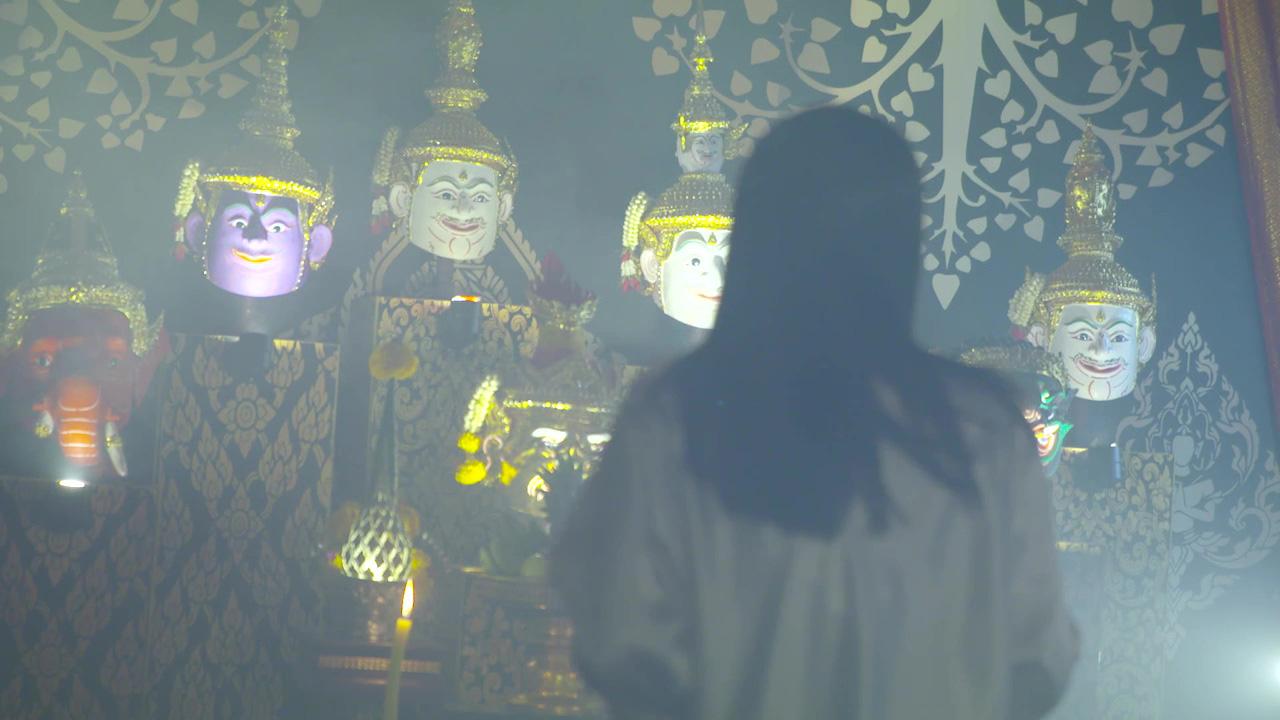 บรรยากาศการถ่ายทำในวันนั้นก็ได้อารมณ์ขนลุกแบบสุดๆ เพราะเป็นการถ่ายทำที่อยู่ในห้องเก็บหัวโขนครูเทพเจ้าทางดนตรีและนาฏศิลป์ไว้มากมาย บวกกับการจัดไฟที่ได้อารมณ์ ยิ่งเพิ่มดีกรีความหลอนแบบไม่มีหยุด ไฮไลต์ของฉากนี้คือผีนางรำเยื้องกรายร่ายรำอันอ่อนช้อย แถมหักตัว สวมชฎามองจ้องตาเขม็ง ใครดูฉากนี้เชื่อว่าหลายๆ คนจะต้องขนหัวลุกตามแน่นอน