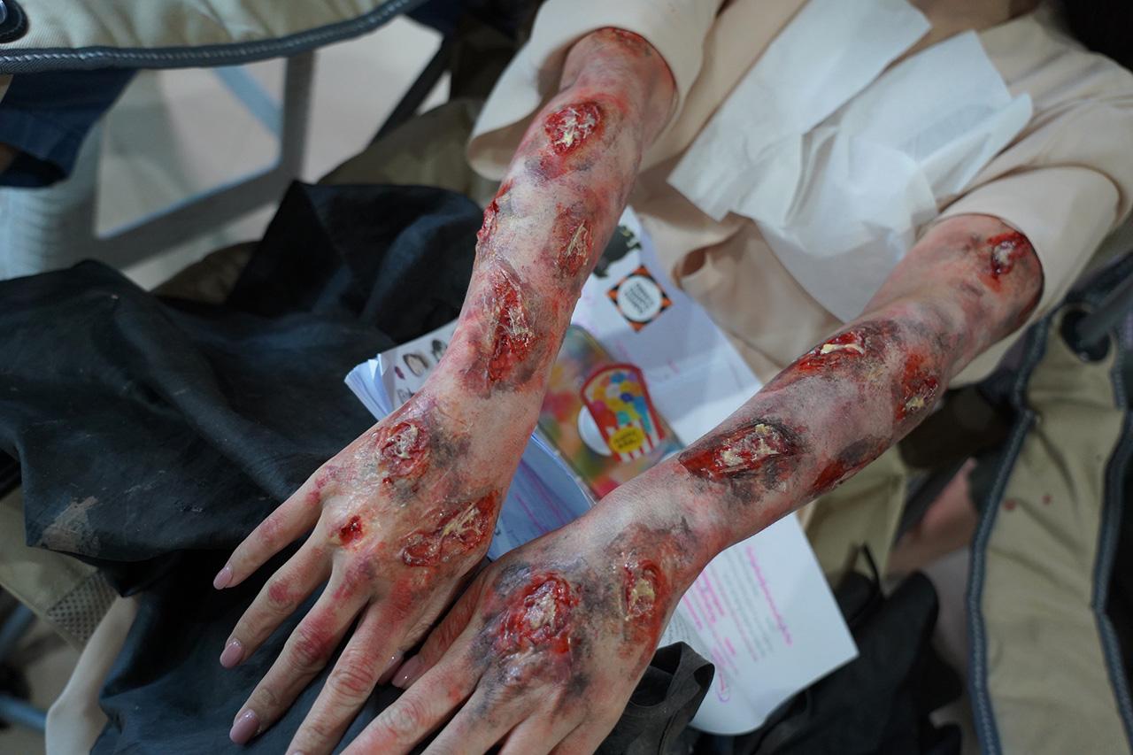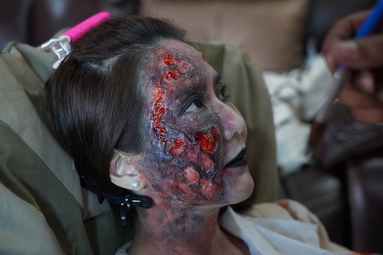 ขั้นตอนที่ 2 เมื่อยางพาราเริ่มแห้งติดไปกับผิวหนัง จะเริ่มการเก็บรายละเอียดด้วยการลง Make up พ่นสีสเปรย์ ซึ่งขั้นตอนนี้จะเป็นขั้นตอนนี้ใช้เวลาในการเก็บรายละเอียดนานพอสมควรด้วยการตกแต่งรอยบาดที่ผิวหนัง รอยน้ำหนองที่ปูดและแตกออกมา และรอยช้ำที่เหมือนโดนทุบให้ดูเนียนที่สุด