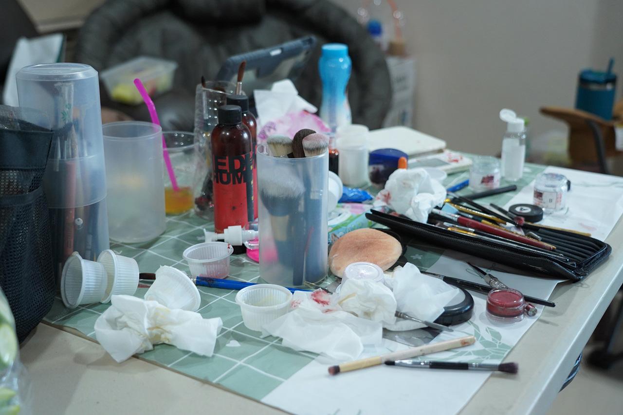 ขั้นตอนที่ 1 การตกแต่งเอฟเฟกต์ทั้งตัวจะเริ่มต้นด้วยลงรองพื้นสีขาวให้ทั่วหน้า หล่อยางพาราขึ้นมา และนำส่วนต่างๆ ที่ต้องการจะตกแต่งมาแปะไว้ตามบริเวณต่างๆ ที่ใบหน้าและตามลำตัว ขั้นตอนนี้จะเน้นความประณีตและต้องระมัดระวังสุดๆ เพราะอุปกรณ์ต่างๆ จะต้องมีความปลอดภัยและมีคุณภาพต่อผิวผู้ใช้มากที่สุด
