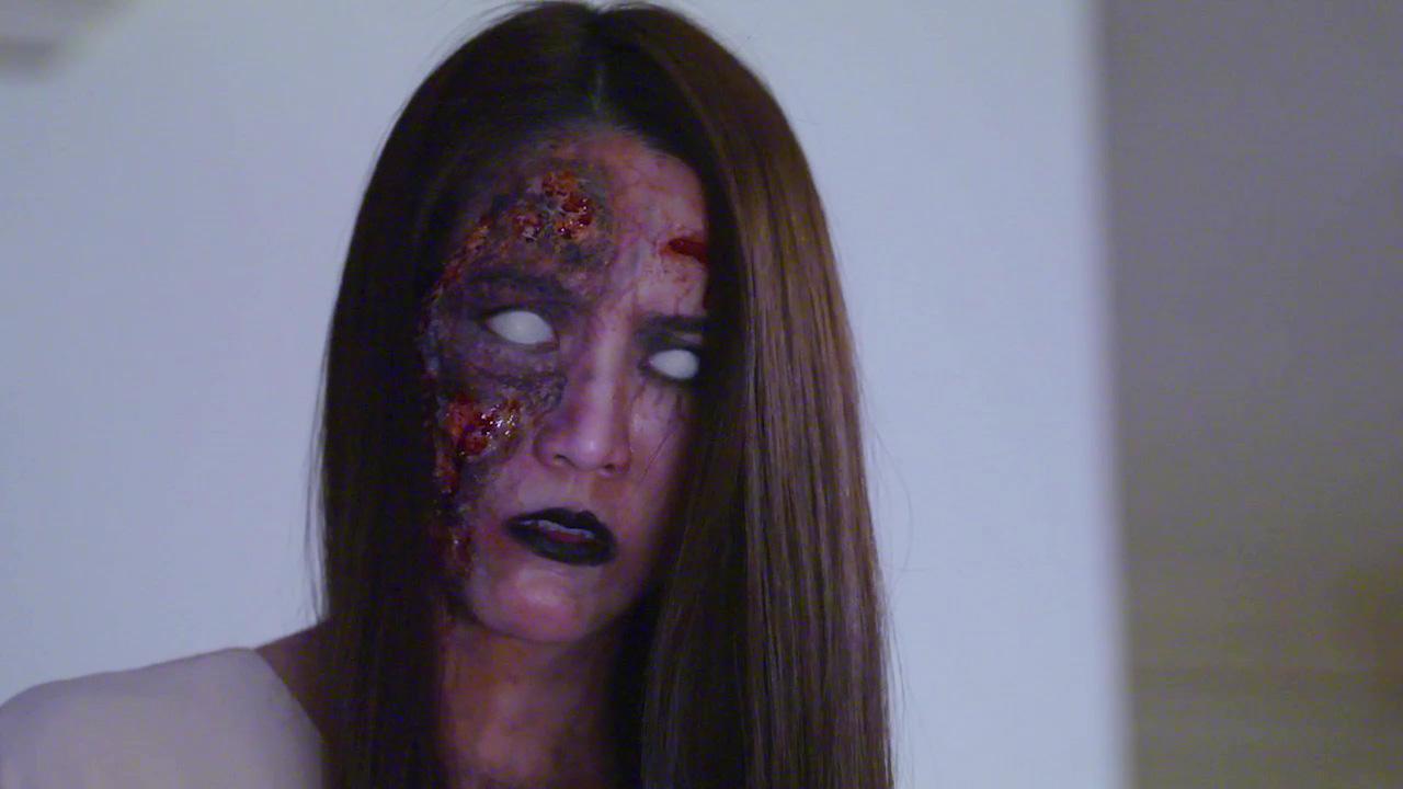ขั้นตอนที่ 3 พร้อมกับการใส่คอนแทคเลนส์สีขาวเพื่อเสริมความน่ากลัว และเพื่อความสมจริง ขั้นตอนนี้ต้องใช้ความระมัดระวังและความชำนาญไม่น้อยเมื่อเริ่มใส่แล้วการมองเห็นจะไม่ชัดเหมือนปกติ และอาจทำให้เกิดอาการระคายเคือง และติดเชื้อจากคอนแทคเลนส์ได้