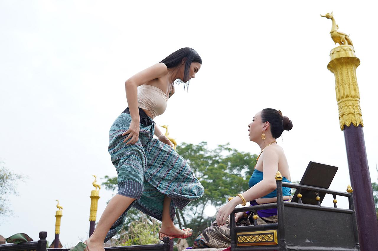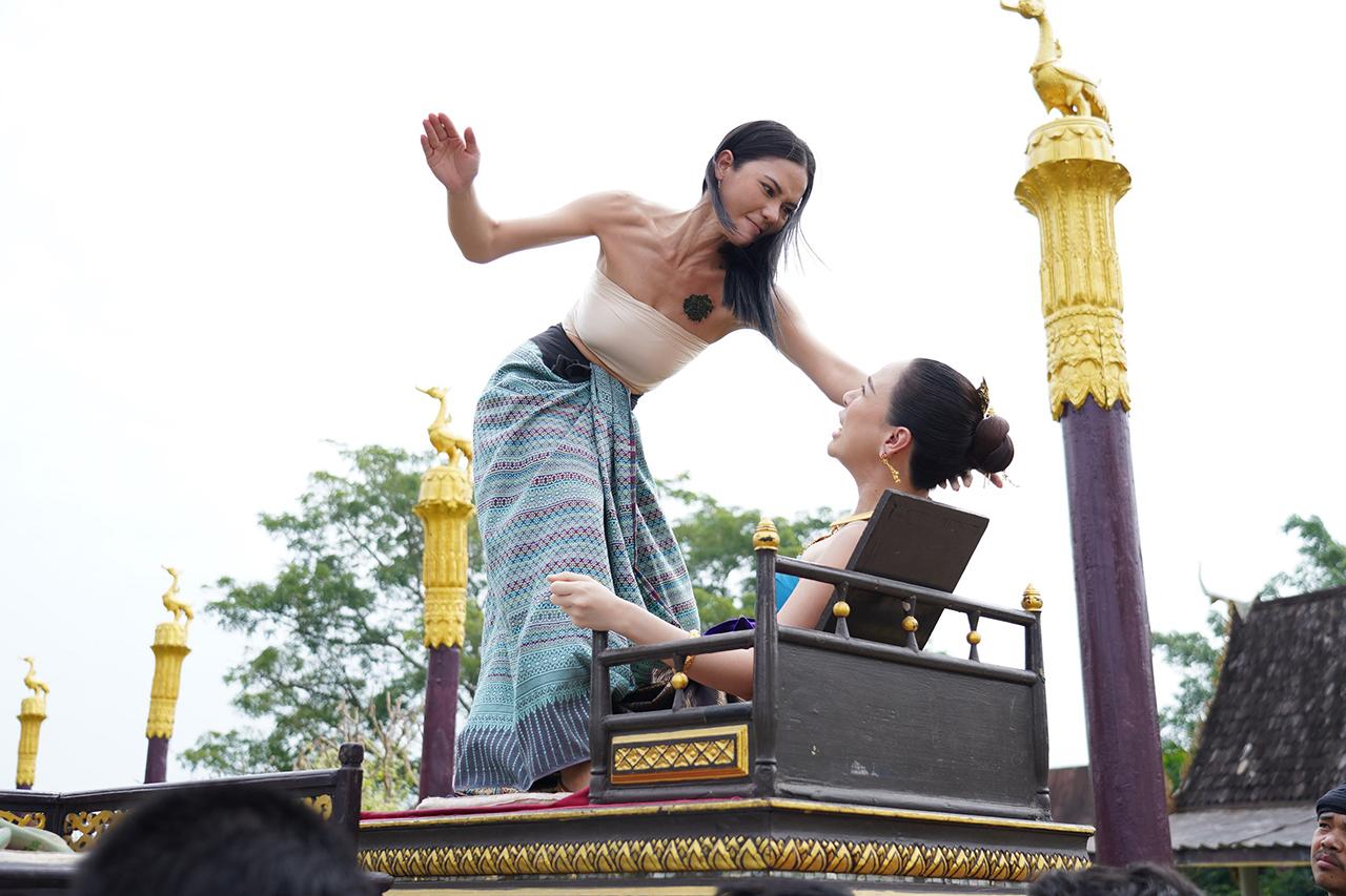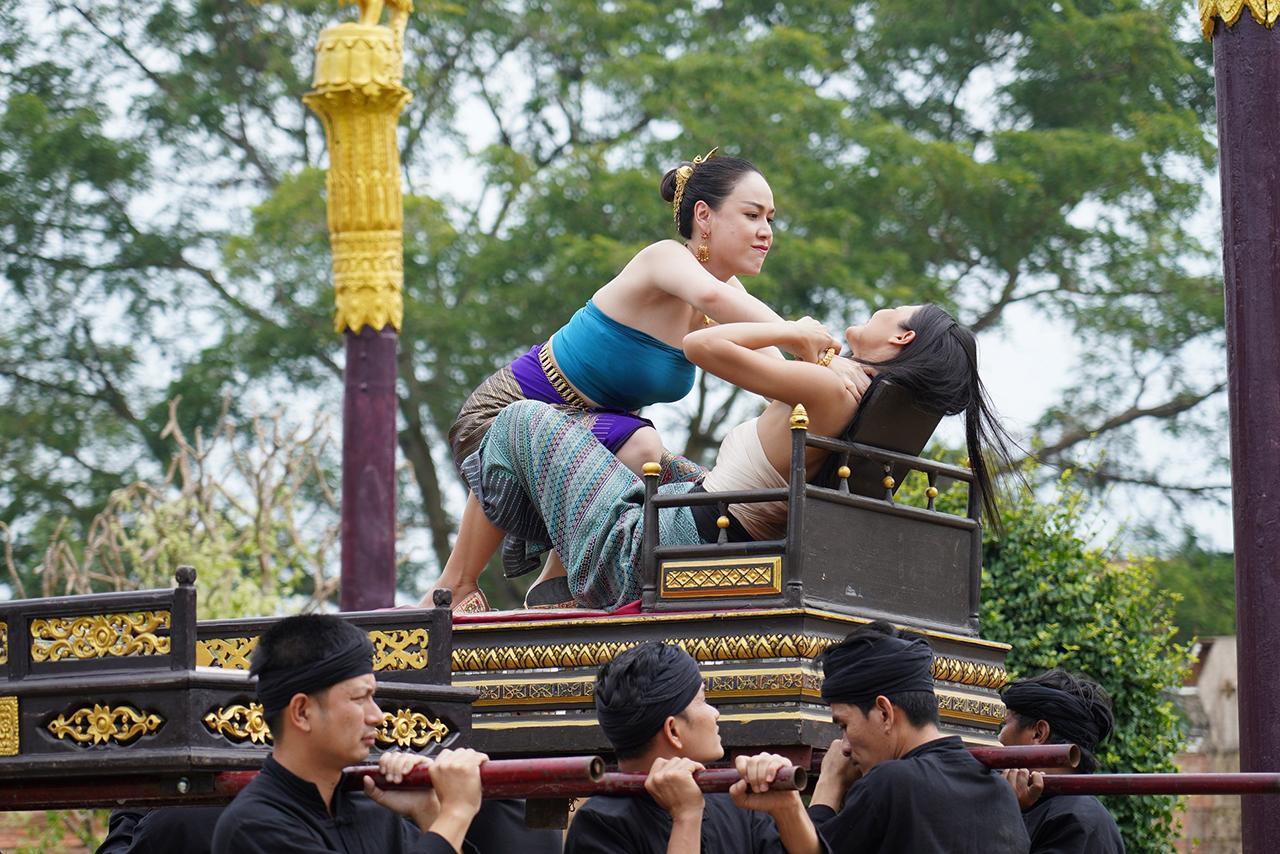 เป็นฉากที่ เจ้านางเกยุรี (ตอง) พา ยูงคำ (ฝ้าย เวฬุรีย์) สาวงามจากคณะนางรำคณะเดียวกับ เอิ้งโหลง (น้ำตาล) มาถวายตัวเป็นนางสนมกับ เจ้าหลวงหน่อฟ้า (กิก ดนัย) โดยสัญญาว่าหากทำให้เจ้าหลวงลืมเอิ้งโหลงและขับออกจากวังได้ เมื่อชูคอได้เป็นนางสนม ยูงคำไม่รีรอ รีบไสเสลี่ยงเพื่อไปอวดโอ้ว่ามีศักดิ์เทียบนางสนมอีกคน เหตุให้ เอิ้งโหลง คิดแค้นไม่พอใจหนัก แถมยูงคำยังพูดจาหมิ่น เอิ้งโหลงเลยจัดหนัก ฟาดตบแบบไม่มีใครยอมใคร
