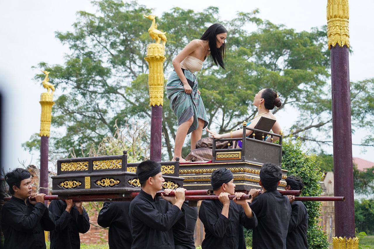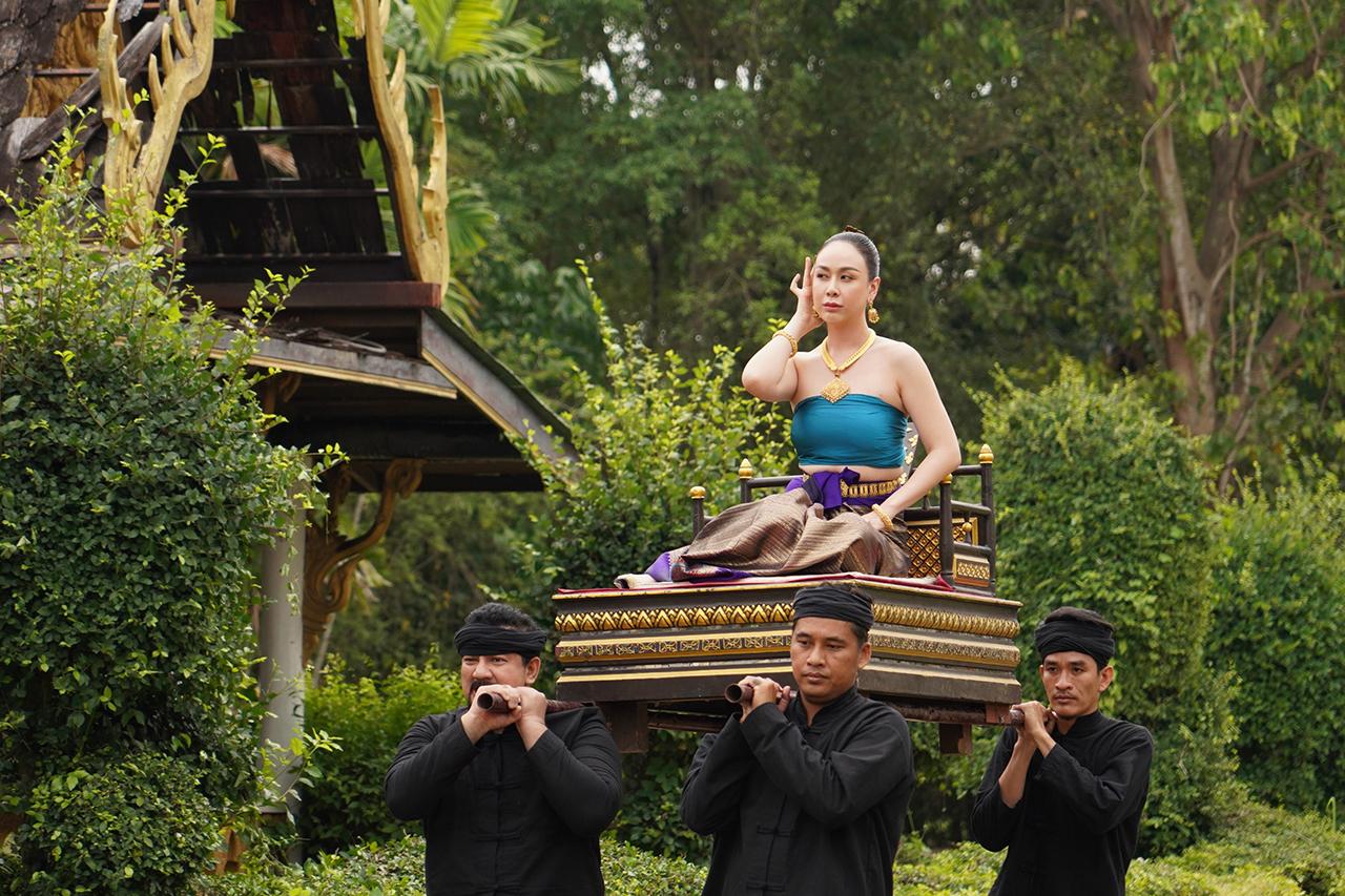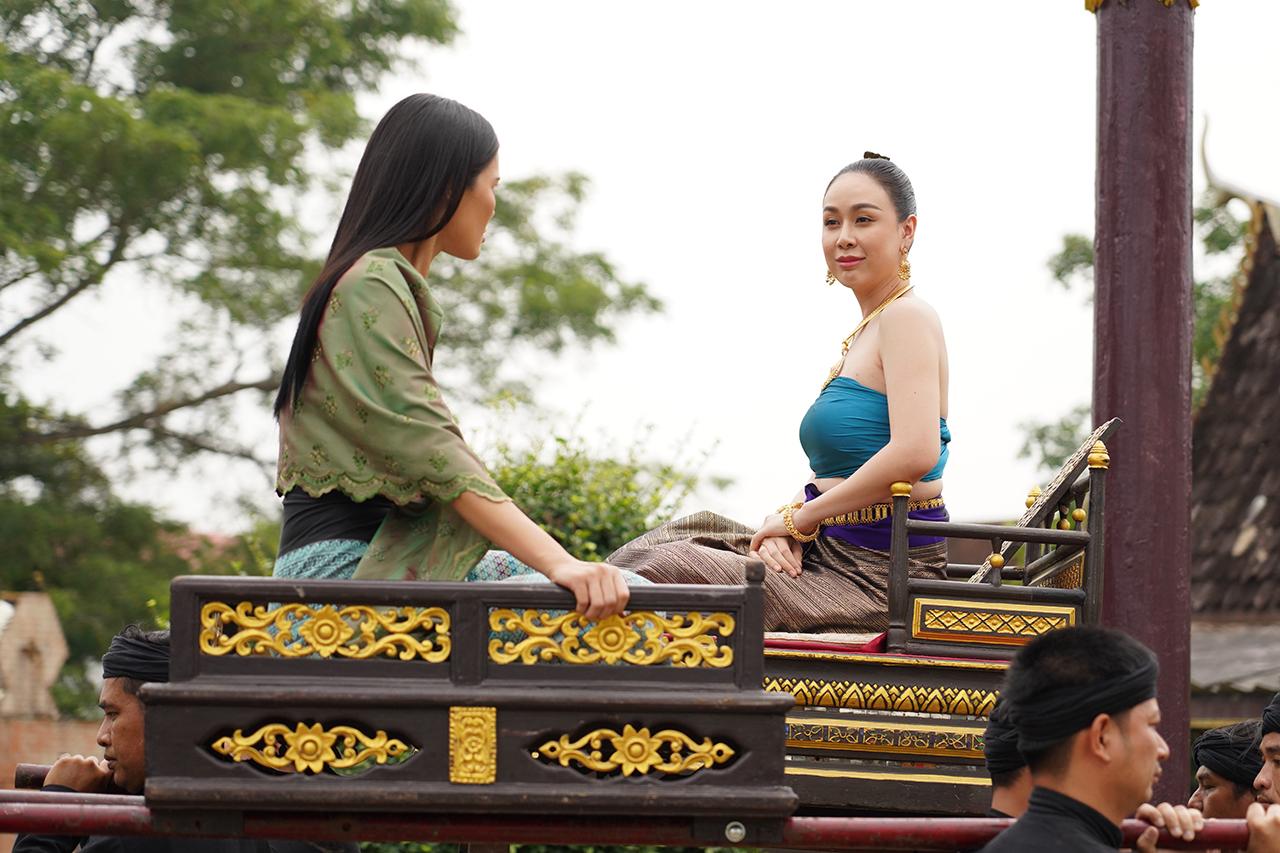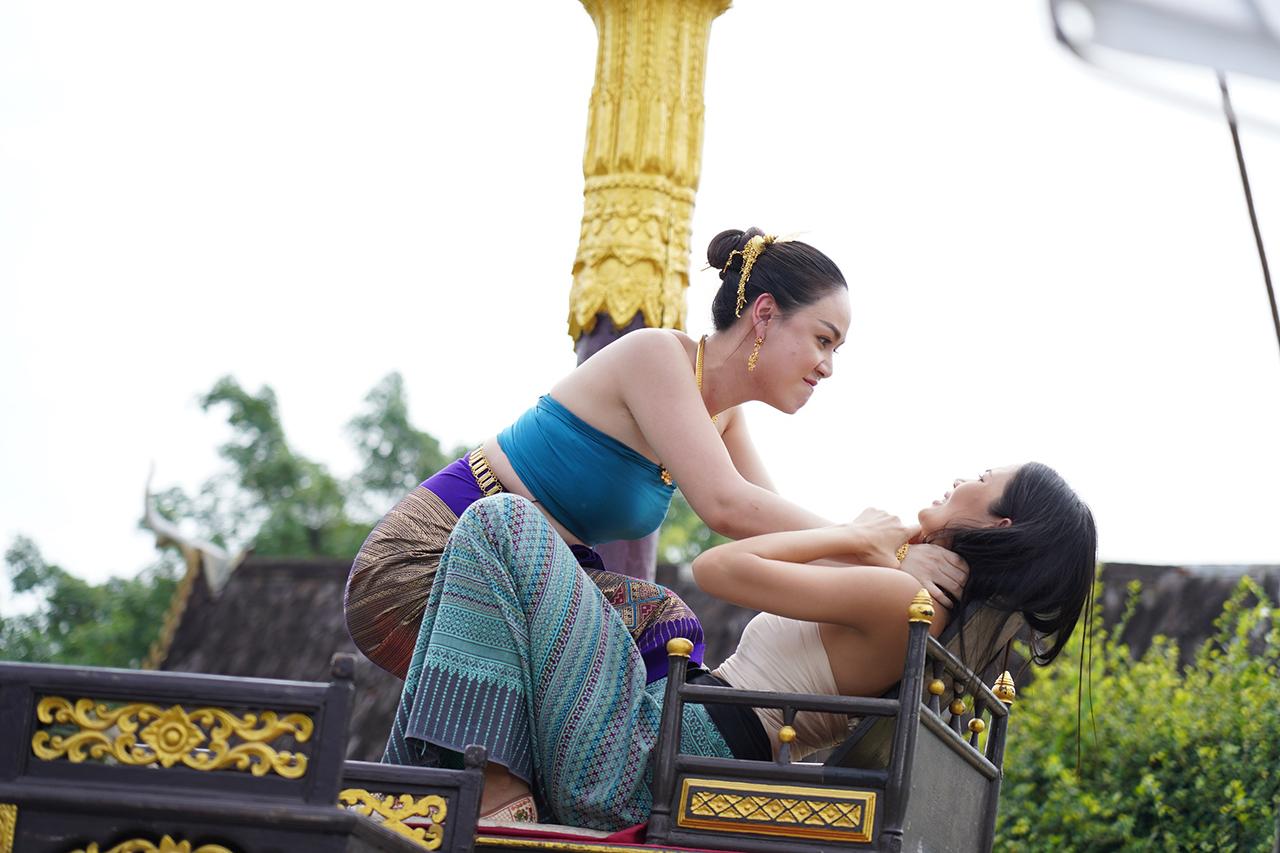 เป็นฉากที่ เจ้านางเกยุรี (ตอง) พา ยูงคำ (ฝ้าย เวฬุรีย์) สาวงามจากคณะนางรำคณะเดียวกับ เอิ้งโหลง (น้ำตาล) มาถวายตัวเป็นนางสนมกับ เจ้าหลวงหน่อฟ้า (กิก ดนัย) โดยสัญญาว่าหากทำให้เจ้าหลวงลืมเอิ้งโหลงและขับออกจากวังได้ เมื่อชูคอได้เป็นนางสนม ยูงคำไม่รีรอ รีบไสเสลี่ยงเพื่อไปอวดโอ้ว่ามีศักดิ์เทียบนางสนมอีกคน เหตุให้ เอิ้งโหลง คิดแค้นไม่พอใจหนัก แถมยูงคำยังพูดจาหมิ่น เอิ้งโหลงเลยจัดหนัก ฟาดตบแบบไม่มีใครยอมใคร