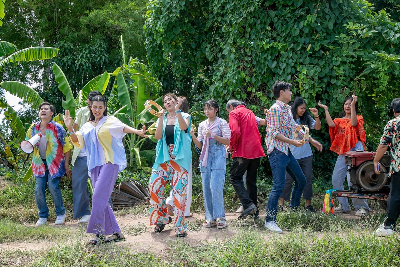 เรามีฉากเบื้องหลังมาฝากกัน โดยก่อนเริ่มถ่ายทำฉากนี้ บรรยากาศภายในกองถ่ายคึกคักกันตั้งแต่เช้า ทีมงานใช้ ทุ่งนา ละแวกสามโคก จ.ปทุมธานี เป็นสถานที่ถ่ายทำ นักแสดงทุกคนพร้อมทั้งเสื้อผ้าหน้าผม เมื่อทุกอย่างพร้อมสรรพ ผู้ช่วยผู้กำกับฯ ก็สั่งแอ็กชัน ขบวนรถแห่ ก็เริ่มขบวน พร้อมเสียงดนตรีที่สนุกสนานเร้าใจ บรรดานักแสดงหลัก และนักแสดงสมทบก็เต้นและร้องกันอย่างเมามัน ทีมงานบางคนนึกสนุกก็ร่วมเต้นไปกับเขาด้วย โดยมี หนุ่มมิว และสาวชาล็อต ยืนร้อง ยืนเต้นอยู่บนรถ ซึ่งทีมกล้องก็เก็บภาพกันมือเป็นระวิง!!
