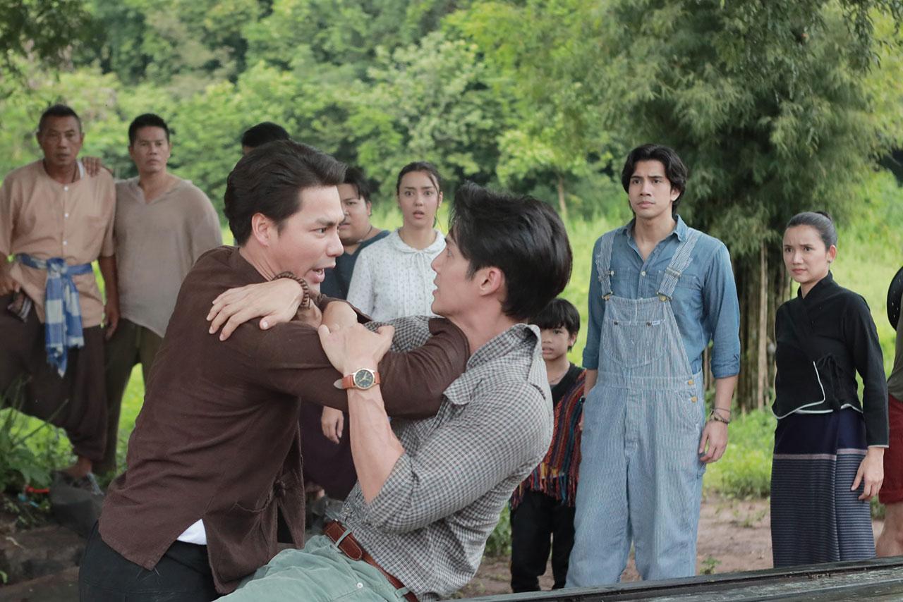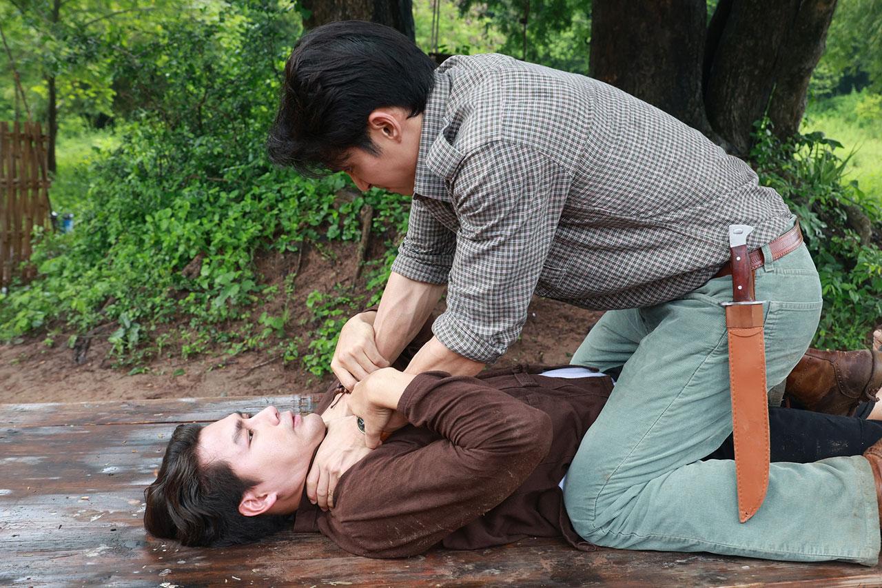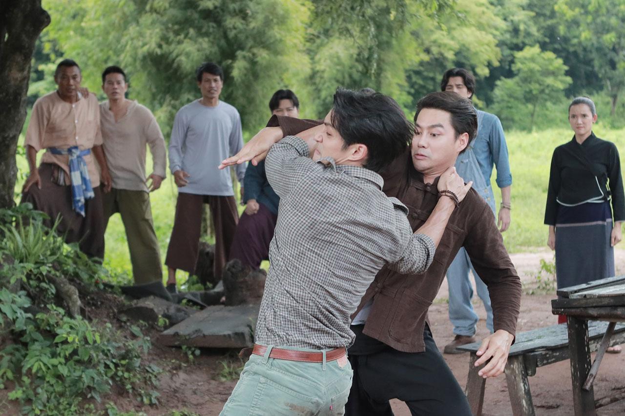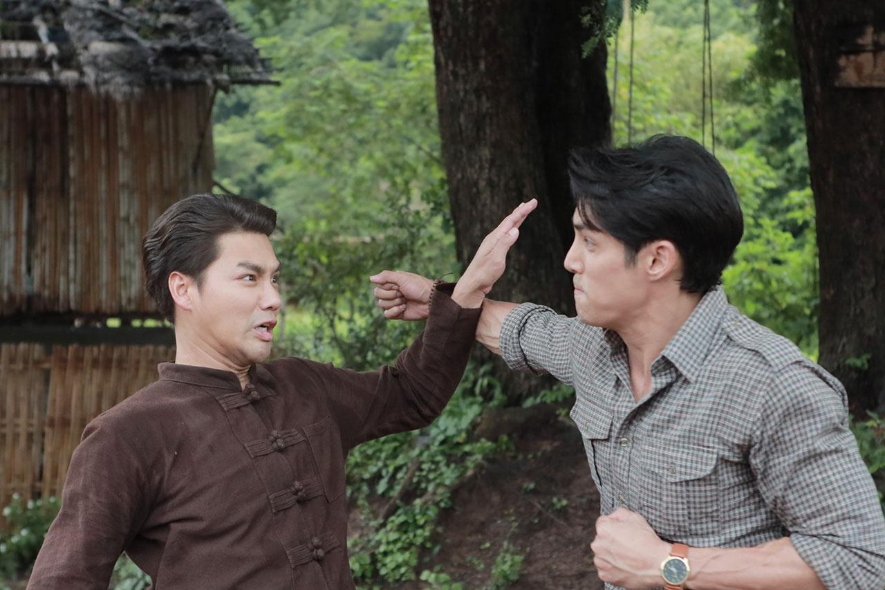 ฉากนี้ถ่ายทำกันที่ สมานฟาร์ม สระบุรี เริ่มต้นต่างคนต่างเจอ ประจันหน้าฟาดฟันกันก่อนจะเริ่มแอ็กชันกัน ทั้งผู้กำกับ อั๋น กรพจน์ และผู้ฝึกคิวบู๊ มาออกแบบท่าบู๊แต่ละกระบวนท่าให้ทั้งคู่ดูทั้งสองคน เด่นคุณ และ เพ็ชร ต้องฝึกแอ็กชันบู๊กันหลายรอบเลย หลุดผิดคิวบ้าง แต่ไม่ได้บาดเจ็บอะไร เพราะทั้งคู่ก็เชี่ยวชาญคิวบู๊กันอยู่แล้ว ถ่ายละครบู๊มาหลายเรื่องแล้ว แต่กว่าจะจบฉากนี้ คิวบู๊หลายกระบวนท่ามาก เล่นเอาเหนื่อย หอบ หมดแรงกันไปทั้งคู่ ส่วน อแมนด้า นั้นยืนเชียร์สวยๆ ยืนลุ้นสบายๆ ไป ก่อนจะไปห้ามในตอนท้าย
