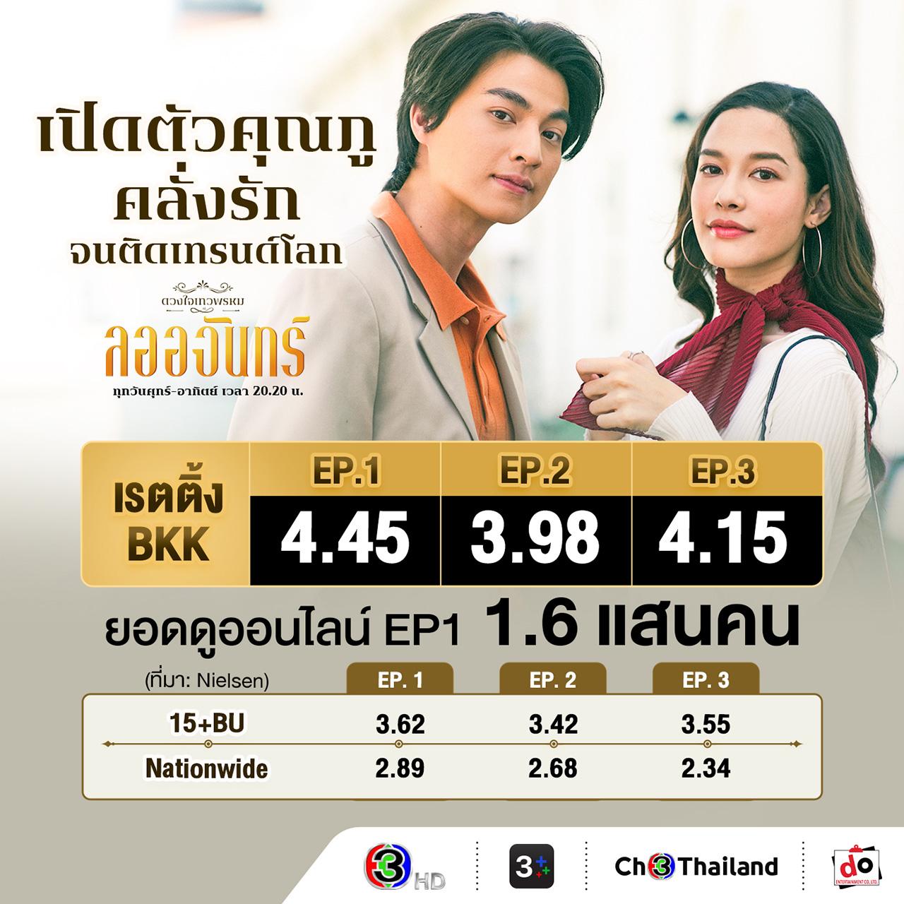 นอกจากกระแสความปังที่พุ่งทะยานติดลมบนแล้ว เรตติ้งเปิดตัวก็ไม่น้อยหน้า สำหรับพื้นที่ในกรุงเทพฯ พุ่งไปถึง 4.45 ส่วนกลุ่ม 15 BU+ (Bangkok and Urban) ดีดไปถึง 3.62 เรตติ้งทั่วประเทศ ทำไปได้ถึง 2.89 กวาดยอดดูย้อนหลังทาง 3Plus สูงถึง 166,744 เปิดตัวได้ปังสมการรอคอยจริงๆ