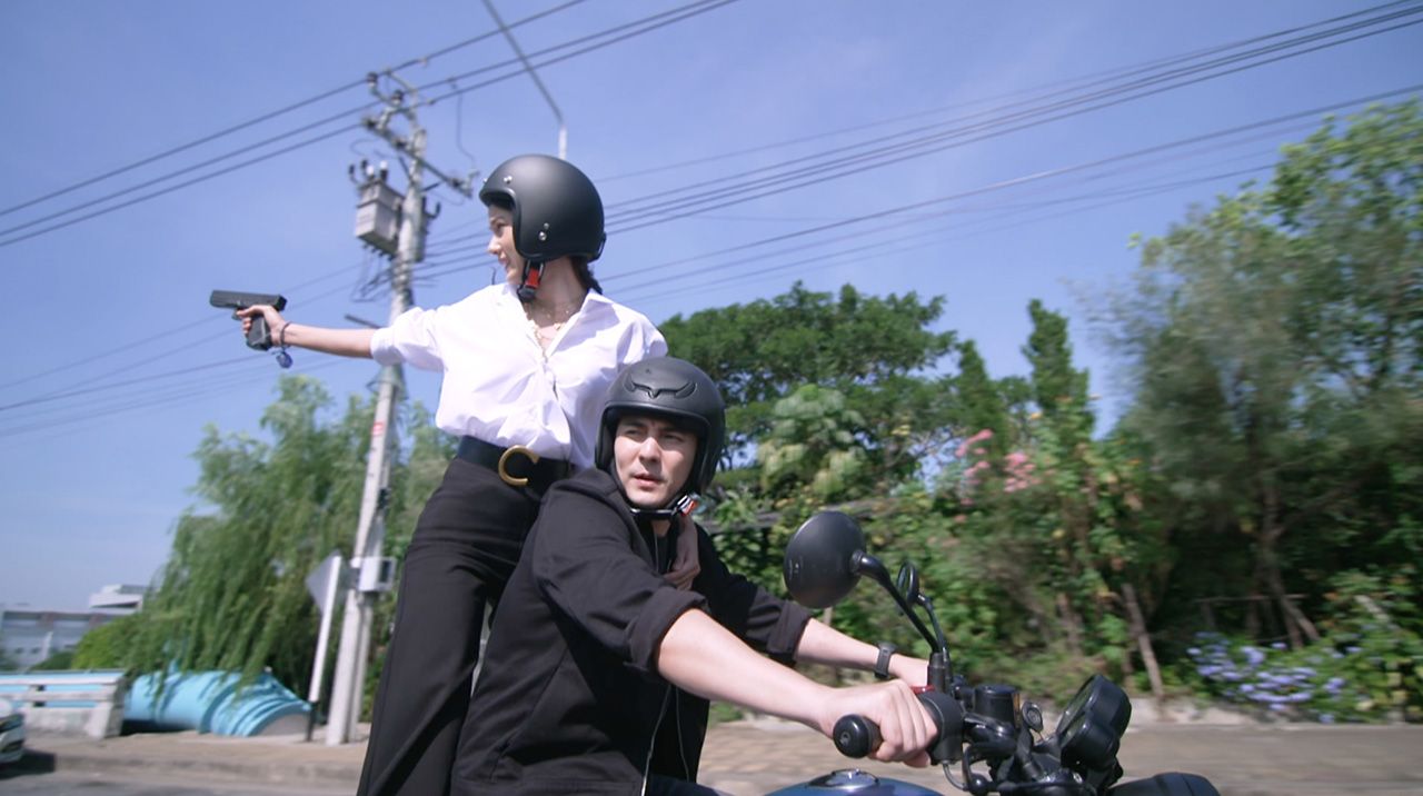 เบื้องหลังฉากนี้ บอกได้เลยว่า นักแสดง ทีมงานและผู้กำกับทุ่มเทกับฉากไล่ล่านี้มาก เพราะอยากได้ภาพออกมาระทึกใจ และได้ภาพ นกันต์ และ นีนี่ ที่สุดเท่ออกมา ซึ่งงานยากของฉากนี้เลย คือนักแสดงต้องแสดงบู๊จัดหนักบนมอเตอร์ไซค์ โดยมี เพชร (พุฒิพงศ์ พรหมสาขา ณ สกลนคร) ผู้กำกับการแสดง ลงมาดูแลอย่างใกล้ชิด พร้อมสอนท่าทางการแอ็กชันให้กับพิ้งค์พลอย ที่ต้องรับบทหนักสุดในฉากนี้ เพราะนอกจากจะต้องลุกขึ้นยืนยิงปืนบนมอเตอร์ไซค์ ด้วยลุคสุดเท่แล้ว พิ้งค์พลอยยังต้องเคลื่อนตัวจากที่เป็นคนซ้อนท้าย กลายมาเป็นนั่งหน้ารถมอเตอร์ไซค์ เพื่อให้สามารถยิงคนร้ายได้อย่างถนัด