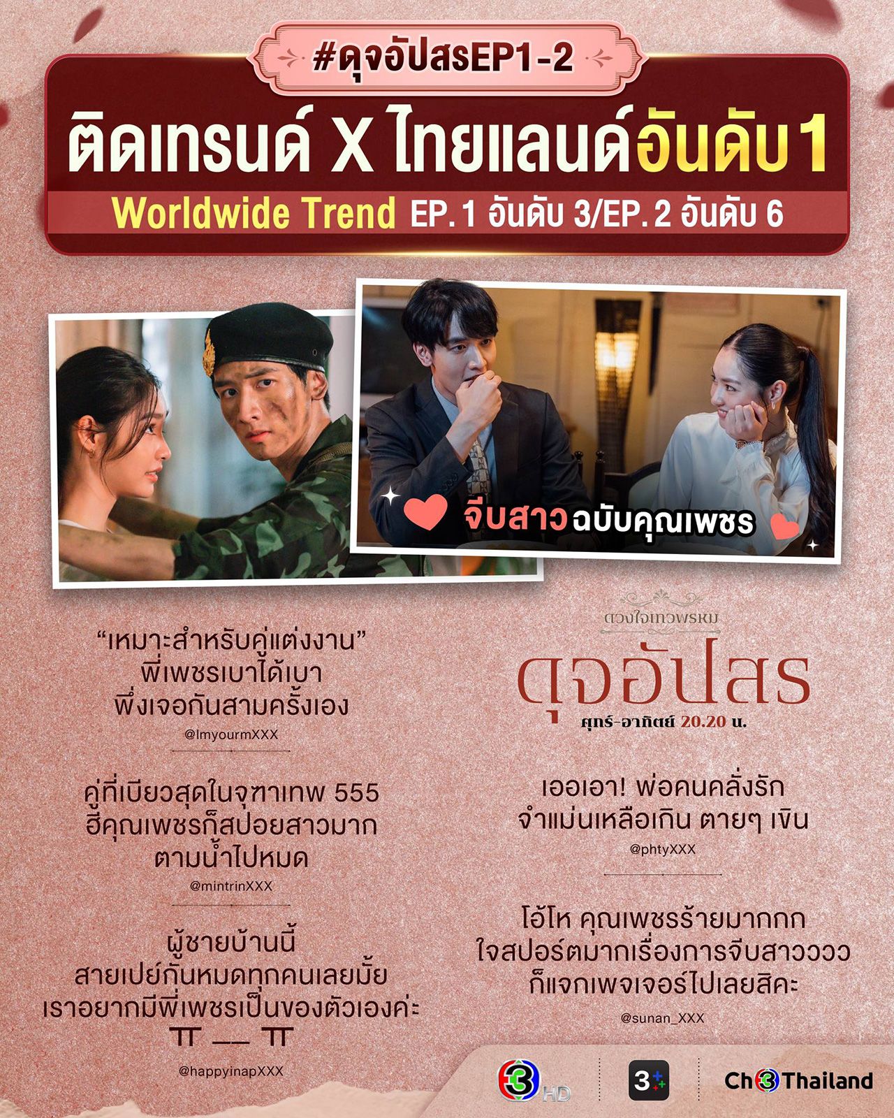 เปิดตัวแรงสมการรอคอย สำหรับละครชุด ดวงใจเทวพรหม เรื่อง “ดุจอัปสร” ทางช่อง 3 ที่เปิดตัวมาด้วยเหตุการณ์พฤษภาทมิฬ ในปี 2535 และฉากเจอกันครั้งแรกของคู่พระนาง บอกเลยว่า เคมีเคใจทำถึงสุดๆ กับฉากแนะนำตัวในตำนานของ คุณเพชร พันตรีหม่อมหลวงอศิร จุฑาเทพ รับบทโดย กองทัพ พีค และ ฟ้า ดุจอัปสร รับบทโดย มิ้นท์ รัญชน์รวี ที่ถ่ายทอดอารมณ์คนตกหลุมรักได้เป๊ะ ทั้งสีหน้า แววตา ท่าทาง ภาษากาย ทำเอาคนดูฟินไปทั่วโลกโซเชียลพา #ดุจอัปสรEP1-2 พุ่งติดเทรนด์ X ประเทศไทย อันดับ 1 กระแสแรงไปถึงเทรนด์โลก EP.1 อันดับ 3 และ EP.2 อันดับ 6 กันเลยทีเดียว นอกจากนี้ยังพาเรตติ้ง EP.1 ของกลุ่มผู้ชมกรุงเทพฯ พุ่งไปถึง 4.3 ในกลุ่ม 15 BU+ (Bangkok and Urban) ทำไปได้ที่ 3.2 และ EP.2 ผู้ชมกรุงเทพฯ ทำไป 4.1 ในกลุ่ม 15 BU+ (Bangkok and Urban) ได้ไป 3.0 เปิดตัวถูกใจคนดูไปทั่วบ้านทั่วเมืองจริงๆ