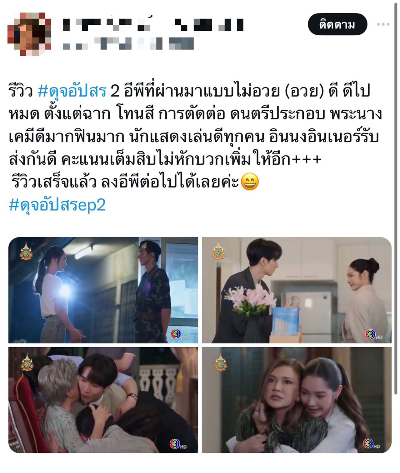 เปิดตัว 2 ตอนแรกทำเอาแฟนๆ ตื่นเต้นกับการกลับมาของ “หม่อมหลวงวิไลรัมภา” ขนาดนี้ สัปดาห์หน้ามาเอาใจช่วย “ฟ้า หรือ ดุจอัปสร” กันต่อ กับเรื่องราวของความรักและความแค้นของทั้งสองตระกูล รอติดตามใน “ดุจอัปสร” ทุกวันศุกร์-อาทิตย์ เวลา 20.20 น. ทางช่อง 3 ดูทีวีกด 33 ดูมือถือกด 3Plus
