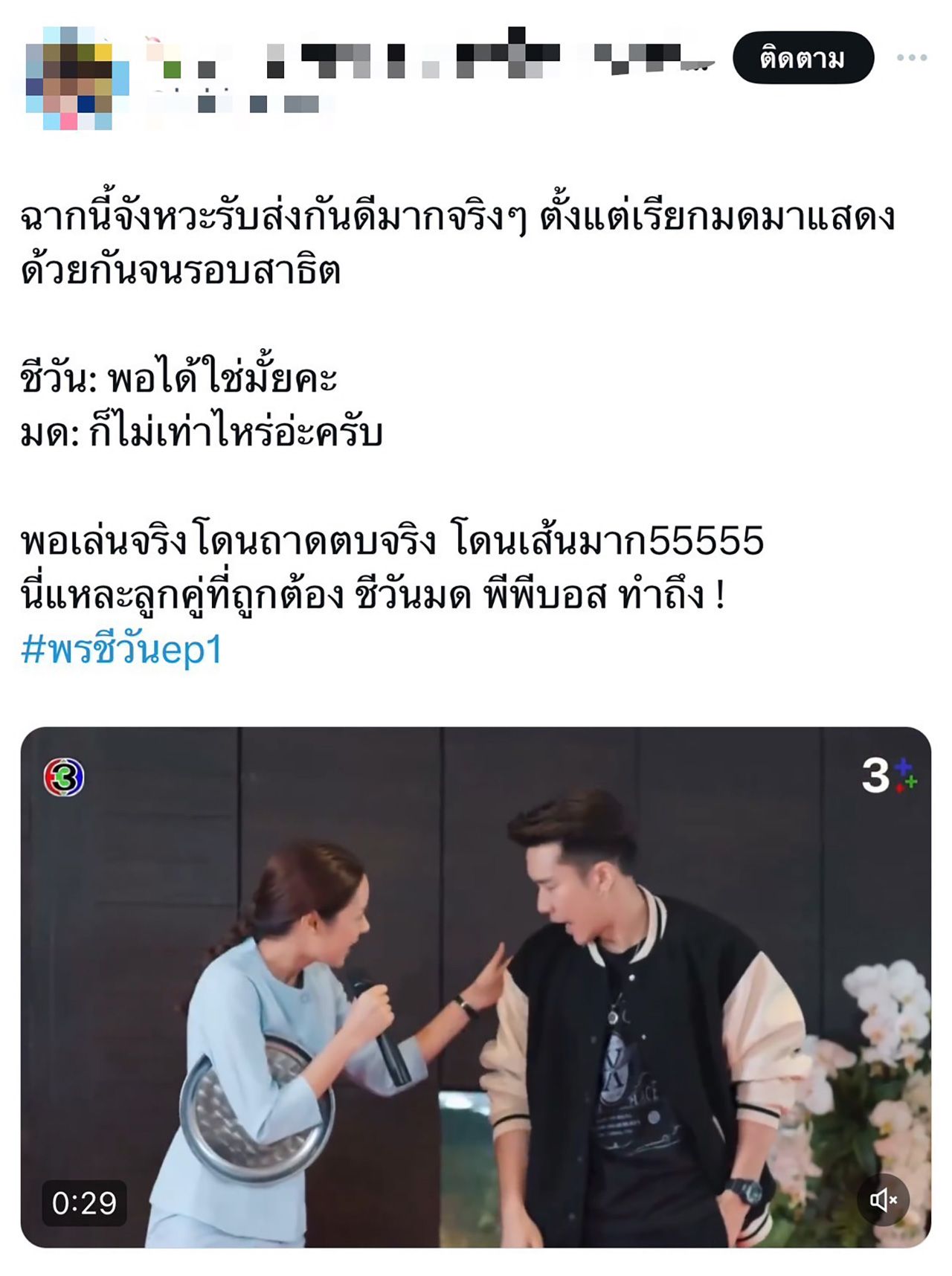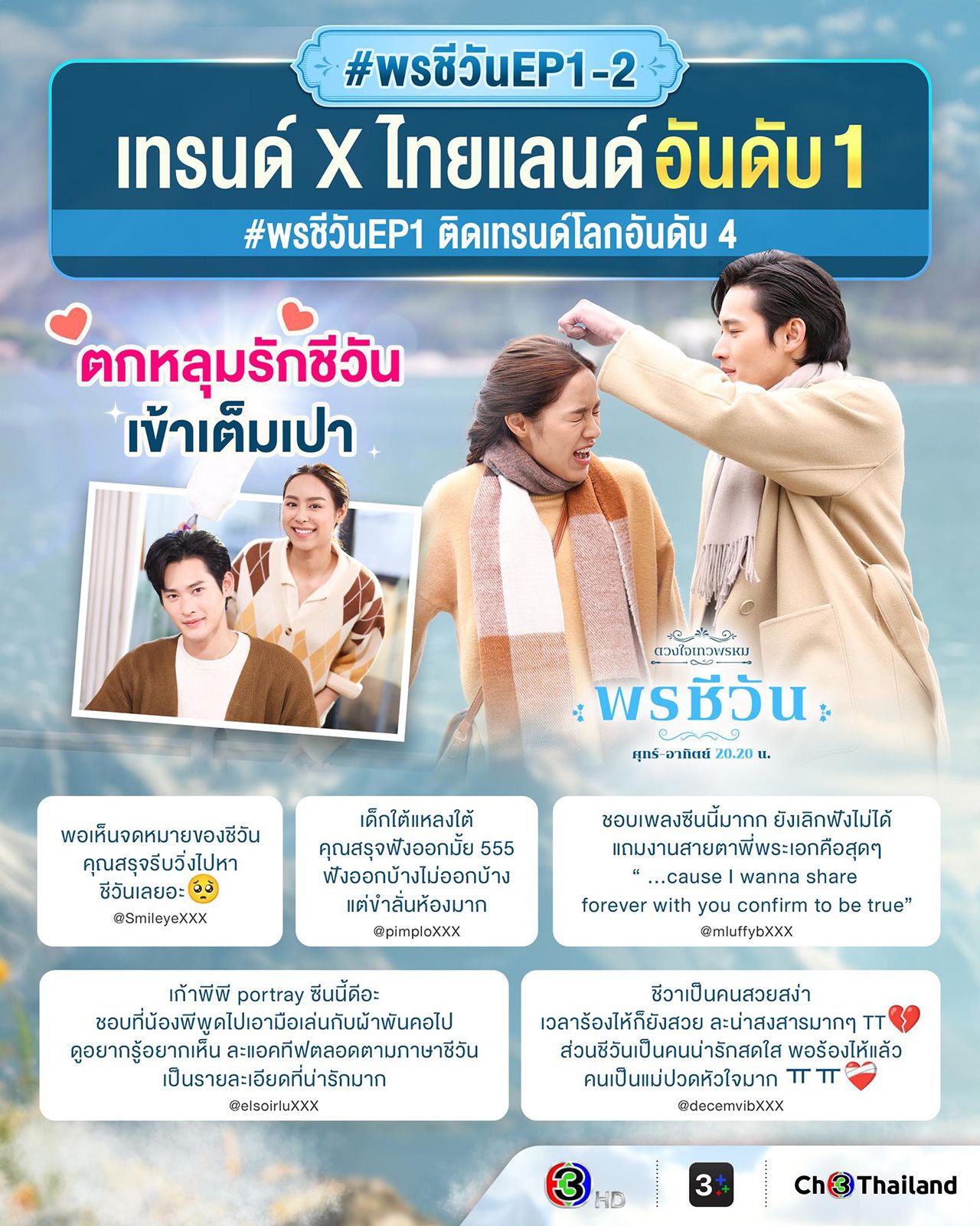 เรียกว่ารับไม้ต่อ “ดุจอัปสร” ได้สมมง เพราะเปิดมาอีพีแรกก็ทำแฟนละครหลงรัก ชีวัน (พีพี ปุญญ์ปรีดี) เข้าเต็มเปา! ส่งแฮชแท็ก #พรชีวันEP1-2 ติดเทรนด์ X อันดับ 1 ไทยแลนด์ และอันดับ 4 ของโลก จับมือปังไปพร้อมกับเรตติ้งเปิดตัวทั่วประเทศ 2.6 สำหรับกลุ่ม 15 BU+ (Bangkok and Urban) ทำไปได้ 3.2 สำหรับ อีพี 2 ทำเรตติ้งทั่วประเทศไว้ที่ 2.1 และในกลุ่ม 15 BU+ (Bangkok and Urban) คว้าไป 2.7 เรียกว่ามัดใจคนดูได้อยู่หมัดจนอดใจรอดูอีพีหน้าไม่ไหว จากความสนุกของกามเทพสาว ชีวัน ลูกสาวคนเดียวของ ม.ล.กระถิน เทวพรหม (น้ำหวาน พิมรา) เริ่มภารกิจรักจับคู่เพื่อนรัก พรชีวา (ครีมมี่ พลอยปภัส) กับ คุณสรุจ (เก้า นพเก้า) นักการทูตสุดหล่อ ตามคำสั่งของ ทวดอ่อน (ตุ๊ก ดวงตา) เรื่องราวความรักสุดอลเวงจึงได้เกิดขึ้น บอกเลยงานนี้สนุกไม่แพ้ในนิยายแน่นอน จักรวาลเทวพรหม ครั้งนี้จะดำเนินต่อไปแบบไหน จับมือลุ้นไปพร้อมกัน