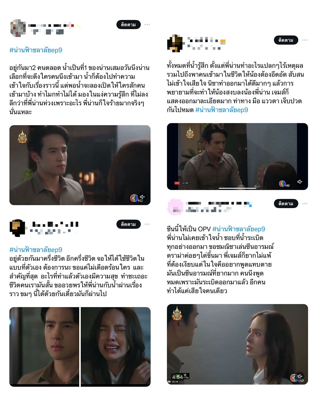แต่โชคดีที่มี ฟ้าคราม (มีน พีรวิชญ์) คอยอยู่เคียงข้าง แม้น้ำรู้ดีฟ้าครามเป็นได้แค่เพื่อนเท่านั้น แต่ทำให้พี่น่านไม่พอใจที่เห็นฟ้าครามอยู่ใกล้ชิดกับน้ำเกินไป ฟ้าครามเลยฟาดกลับว่าจริงๆ แล้ว น่านหวงหรือห่วงน้ำกันแน่ ทำให้น้ำต้องระเบิดอารมณ์ ระบายความอึดอัดที่มีอยู่ในใจ จนเกิดกระแสชื่นชมในทักษะการแสดงของนางเอกสาวณิชากันอย่างล้นหลาม