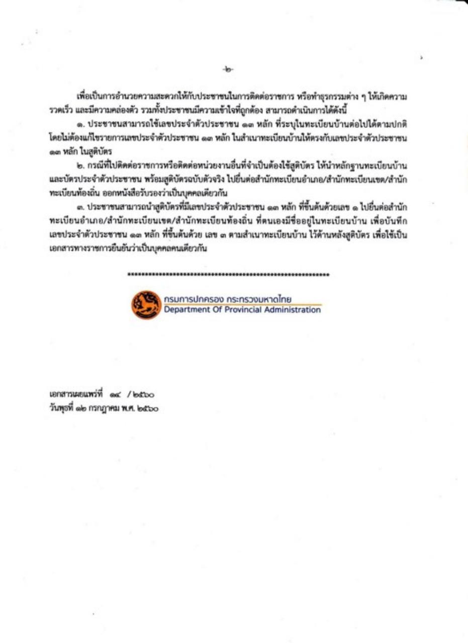ประชาชนสามารถใช้เลขประจำตัวประชาชน 13 หลัก ที่ระบุในทะเบียนบ้านต่อไปได้ตามปกติ โดยไม่ต้องแก้ไขรายการเลขประจำตัวประชาชน 13 หลัก ในสำเนาทะเบียนบ้านให้ตรงกับเลขประจำตัวประชาชน 13 หลักในสูติบัตร