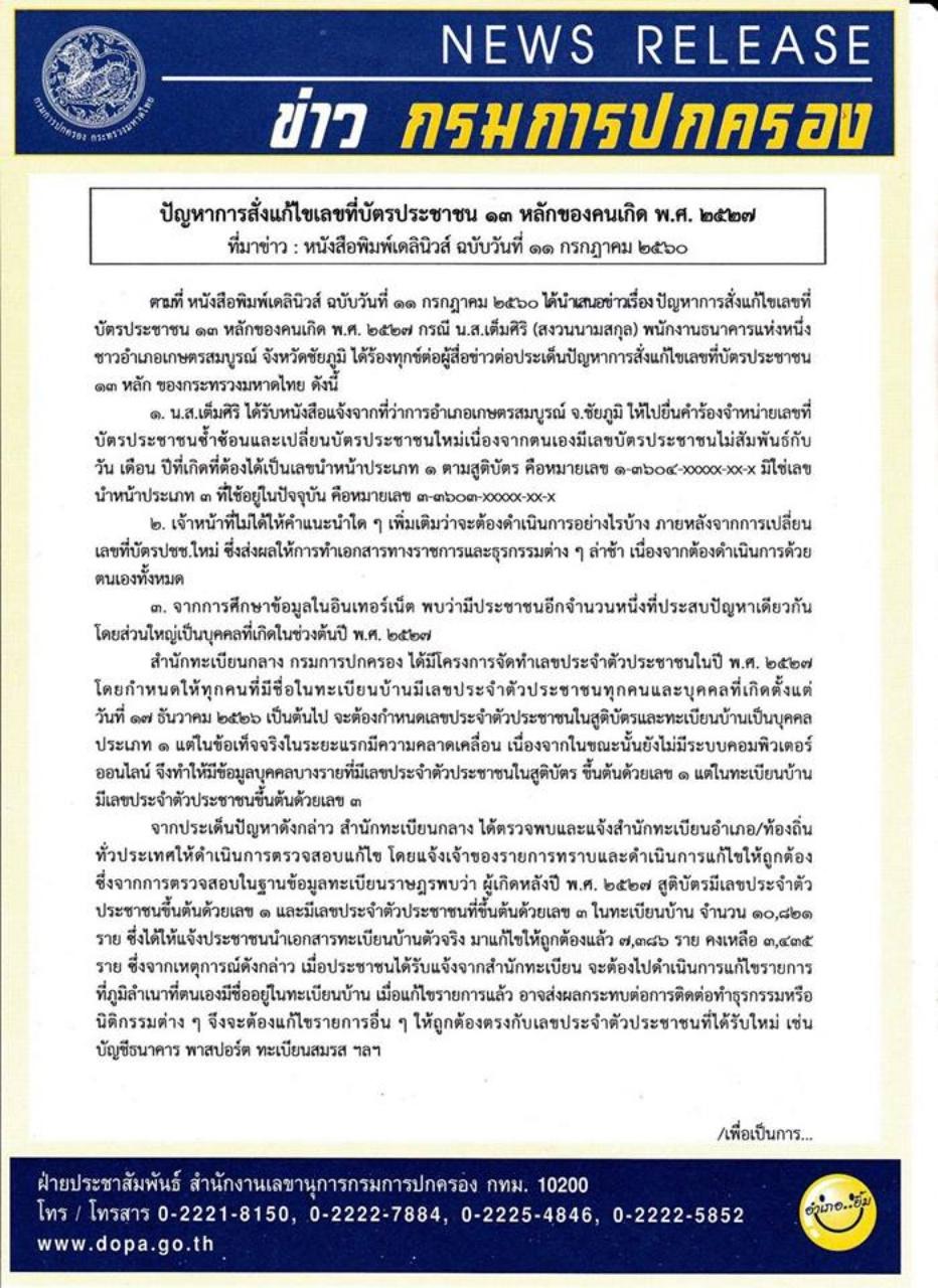 จากข่าวที่ทางกรมการปกครองได้ออกมาชี้แจงว่า ได้ตรวจสอบในฐานข้อมูลทะเบียนราษฎร พบว่า ผู้เกิดหลังปี พ.ศ.2527 สูติบัตรมีเลขประจำตัวประชาชนขึ้นต้นด้วยเลข 1 และมีเลขประจำตัวประชาชนที่ขึ้นต้นด้วยเลข 3 ในทะเบียนบ้าน จำนวน 10,821 ราย กระจายกันไปทั่วประเทศ ซึ่งได้แจ้งให้ประชาชนนำเอกสารทะเบียนบ้านตัวจริง มาแก้ไขให้ถูกต้องแล้ว จำนวน 7,386 ราย คงเหลือ 3,435 ราย ส่วนหลังปี 2527 นั้นก็อาจจะมีบ้างเล็กน้อยแต่รวมแล้วไม่มากเท่ากับที่เจอหมื่นกว่าราย