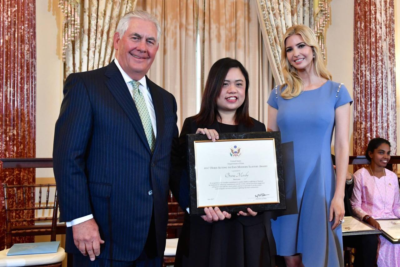 ทีมข่าวเฉพาะกิจไทยรัฐออนไลน์ ได้เปิดใจคุณบุ๋ม วีรวรรณ มอสบี้ ผู้ที่ได้มีโอกาสสนทนากับสุภาพสตรีหมายเลขสอง “อิวานกา ทรัมป์” บุตรสาวของโดนัลด์ ทรัมป์ ในโอกาสเข้ารับรางวัลนักต่อสู้ด้านการค้ามนุษย์ หรือ TIP Hero ประจำปี ค.ศ. 2017 ให้กับผู้ที่มีผลงานที่ได้รับการยกย่องในการต่อต้านการค้ามนุษย์จากประเทศต่างๆ ที่กระทรวงการต่างประเทศสหรัฐอเมริกา