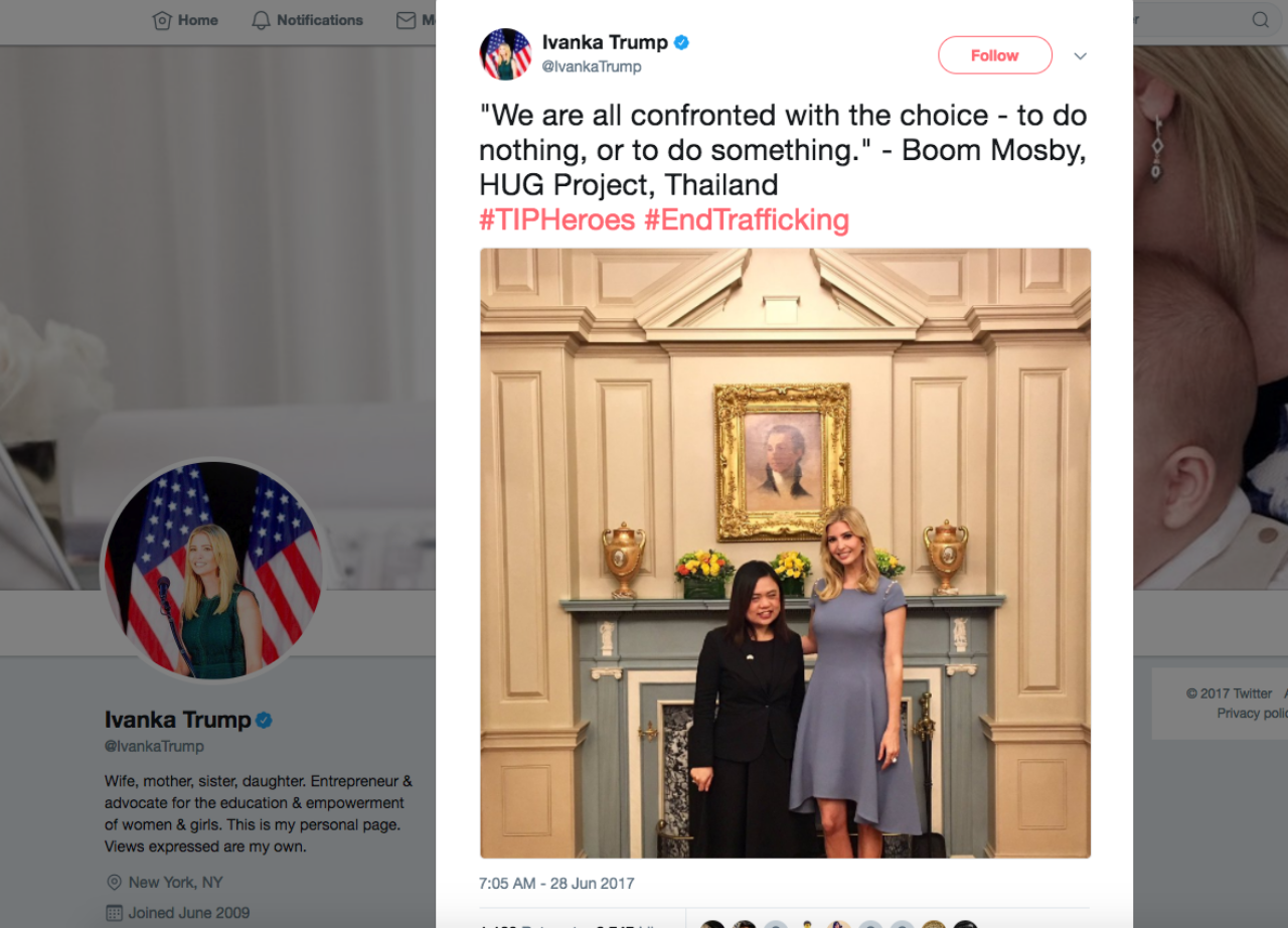 จากนั้น ตนจึงบอกกับลูกสาวประธานาธิบดีสหรัฐฯ ว่า ขอบคุณอิวานกาที่ใส่ใจในประเด็นปัญหาการค้ามนุษย์ และในฐานะที่เขาเป็นผู้หญิงเป็นลูกของผู้นำระดับโลก อยากให้ใช้โอกาสในบทบาทของเขาที่จะเป็นกระบอกเสียงในการแก้ไขปัญหาการค้ามนุษย์ และผู้เสียหายแต่ละคนอยากให้กำลังใจอิวานกาที่จะใช้บทบาทในการมีชื่อเสียง เพื่อโปรโมตการแก้ไขปัญหาการค้ามนุษย์