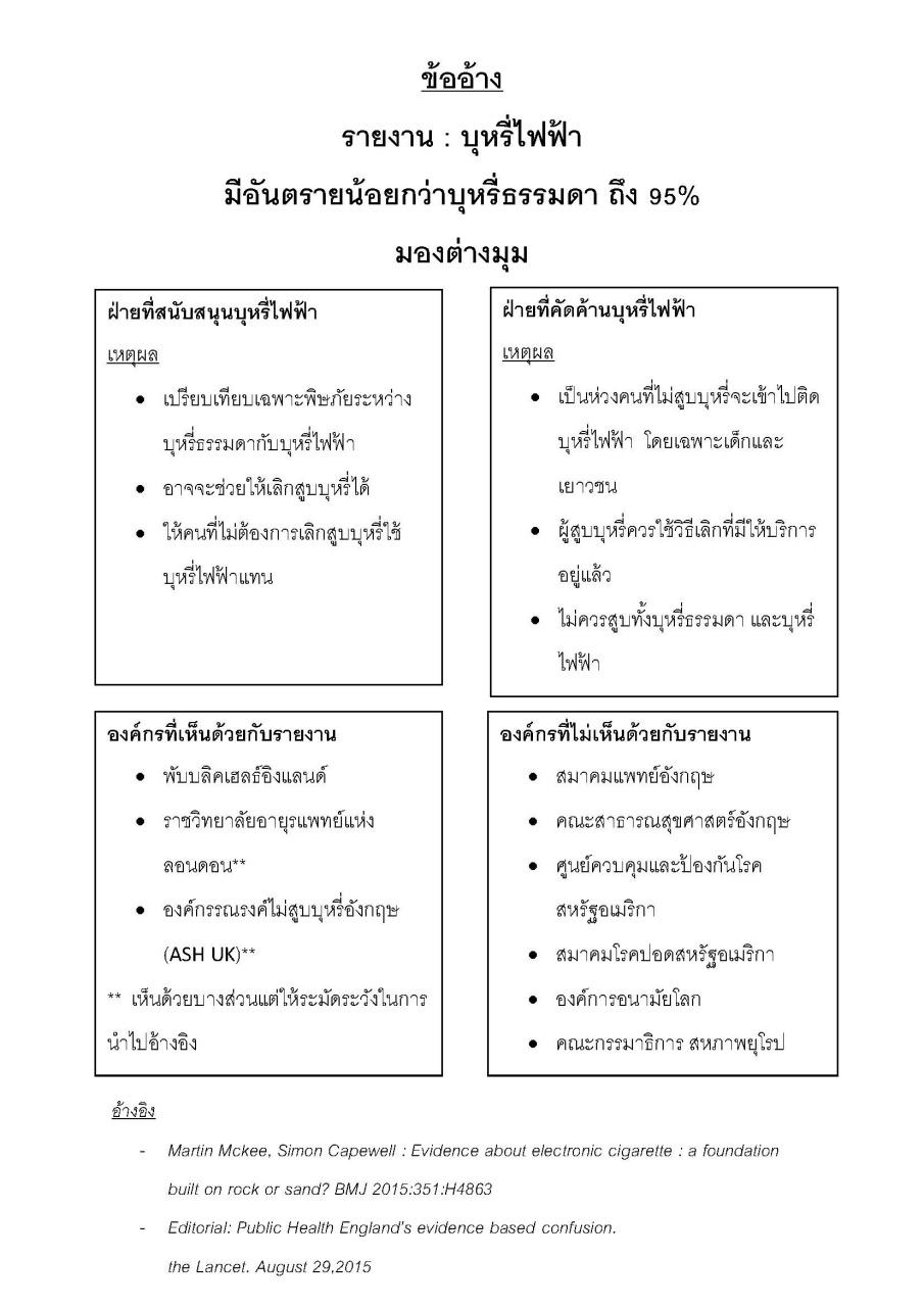 ฝ่ายต้านบุหรี่ไฟฟ้า - เรื่องนี้เป็นข้อมูลเก่าที่ประชุมกันเมื่อปี 2556 รายงานเมื่อปี 2558 และไม่มีหลักฐาน มีเพียงความเห็นของผู้เชี่ยวชาญกลุ่มหนึ่ง และมีอย่างน้อย 2 รายเกี่ยวข้องกับบริษัทบุหรี่ไฟฟ้า โดยมีเพียง 2 องค์กรที่ยอมรับ โดยยอมรับแค่บางส่วนเท่านั้น ขณะที่มีองค์กรที่ค้านมากกว่า กระทรวงสาธารณสุขอังกฤษ Public Health England, องค์การอนามัยโลก, สหภาพยุโรป ต่างก็ค้านรายงานที่ว่า “บุหรี่ไฟฟ้าปลอดภัยกว่า 95%”