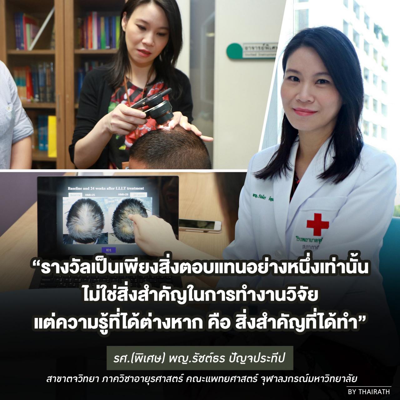 ทั้งนี้ พญ.รัชต์ธร คว้ารางวัลที่ 1 ในประเภทงานวิจัยที่ได้รับการตีพิมพ์ในรูปแบบของโปสเตอร์ ซึ่งเป็นงานวิจัยชิ้นแรกในเอเชีย ในการยืนยันประสิทธิภาพของกระบวนการยิงด้วยเลเซอร์ความเข้มข้นต่ำ เพื่อขจัดปัญหาโรคผมร่วงที่เกิดจากพันธุกรรม ซึ่งจากผลการศึกษาพบว่าการใช้เลเซอร์ที่มีความเข้มข้นต่ำในการกระตุ้นให้หนังศีรษะสร้างเส้นผมนั้น ให้ผลดีที่ 24 สัปดาห์ โดยความสำเร็จครั้งนี้ถือได้ว่าเป็นครั้งแรกของการศึกษาในประเทศไทย